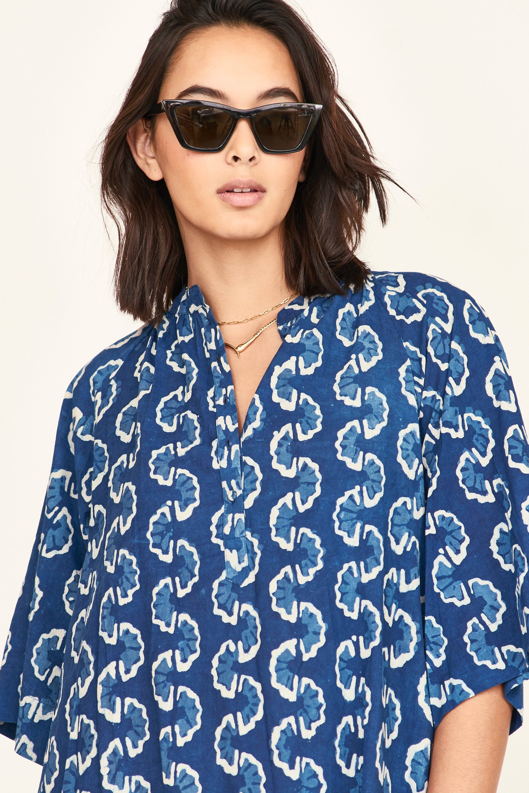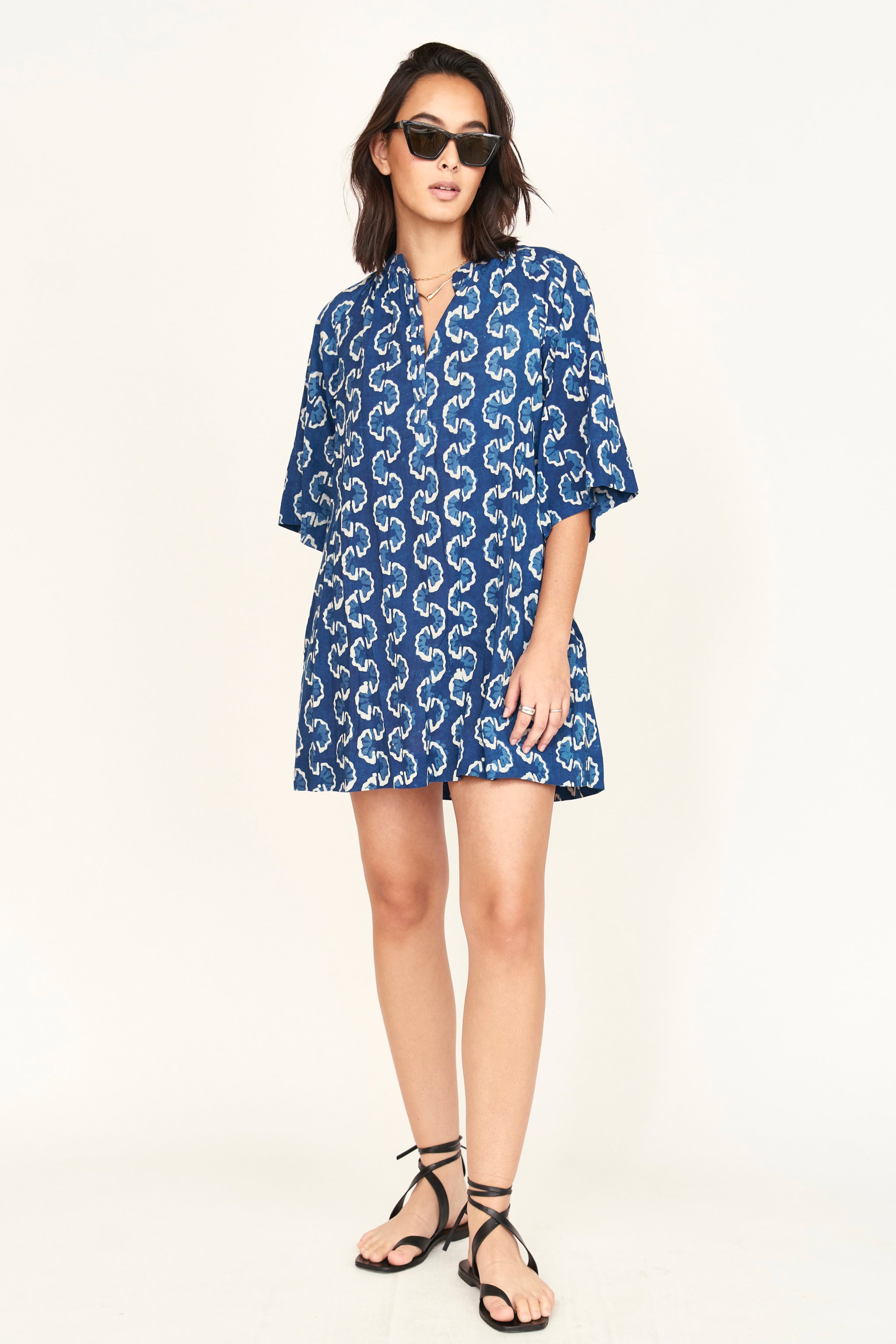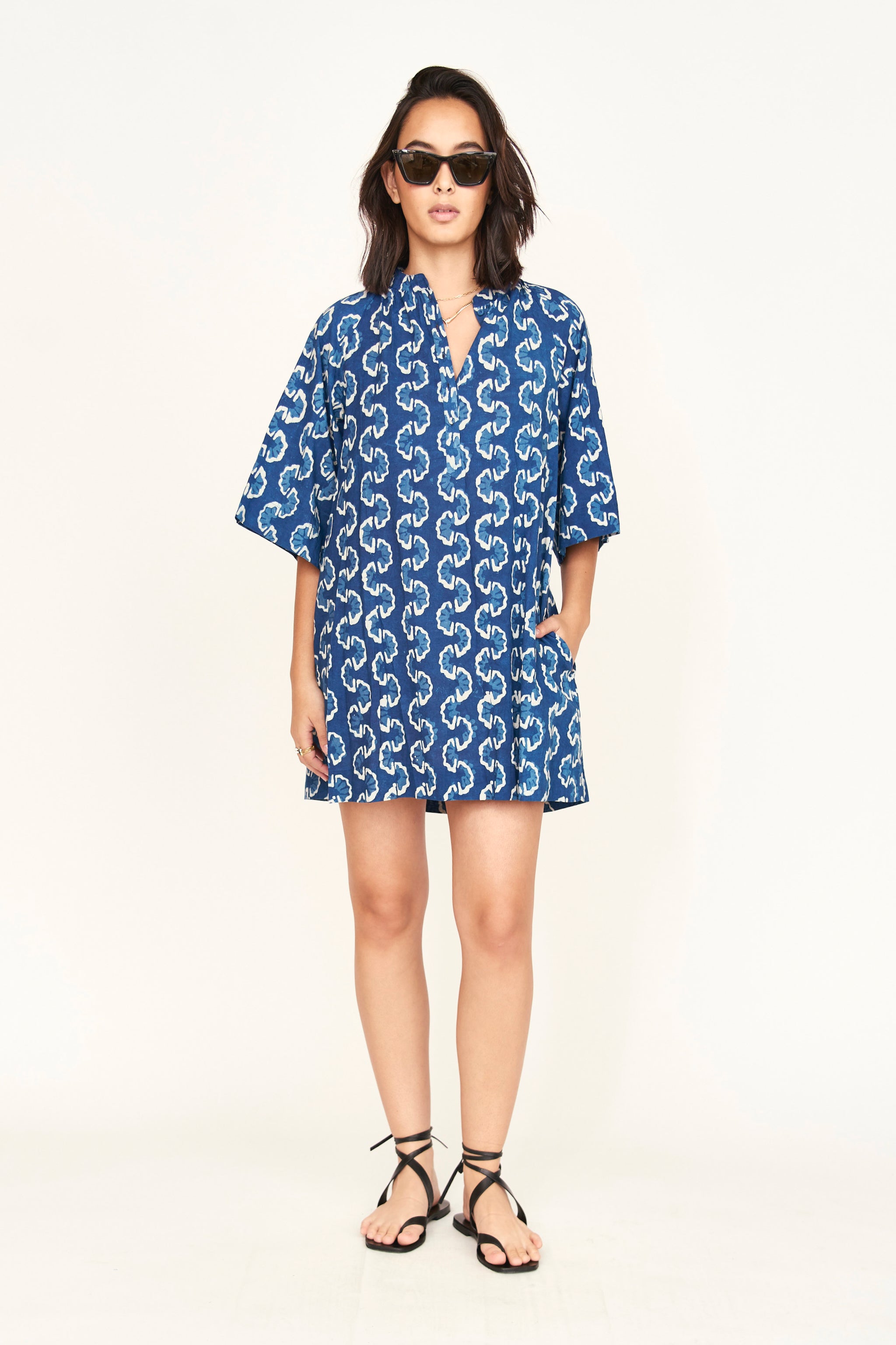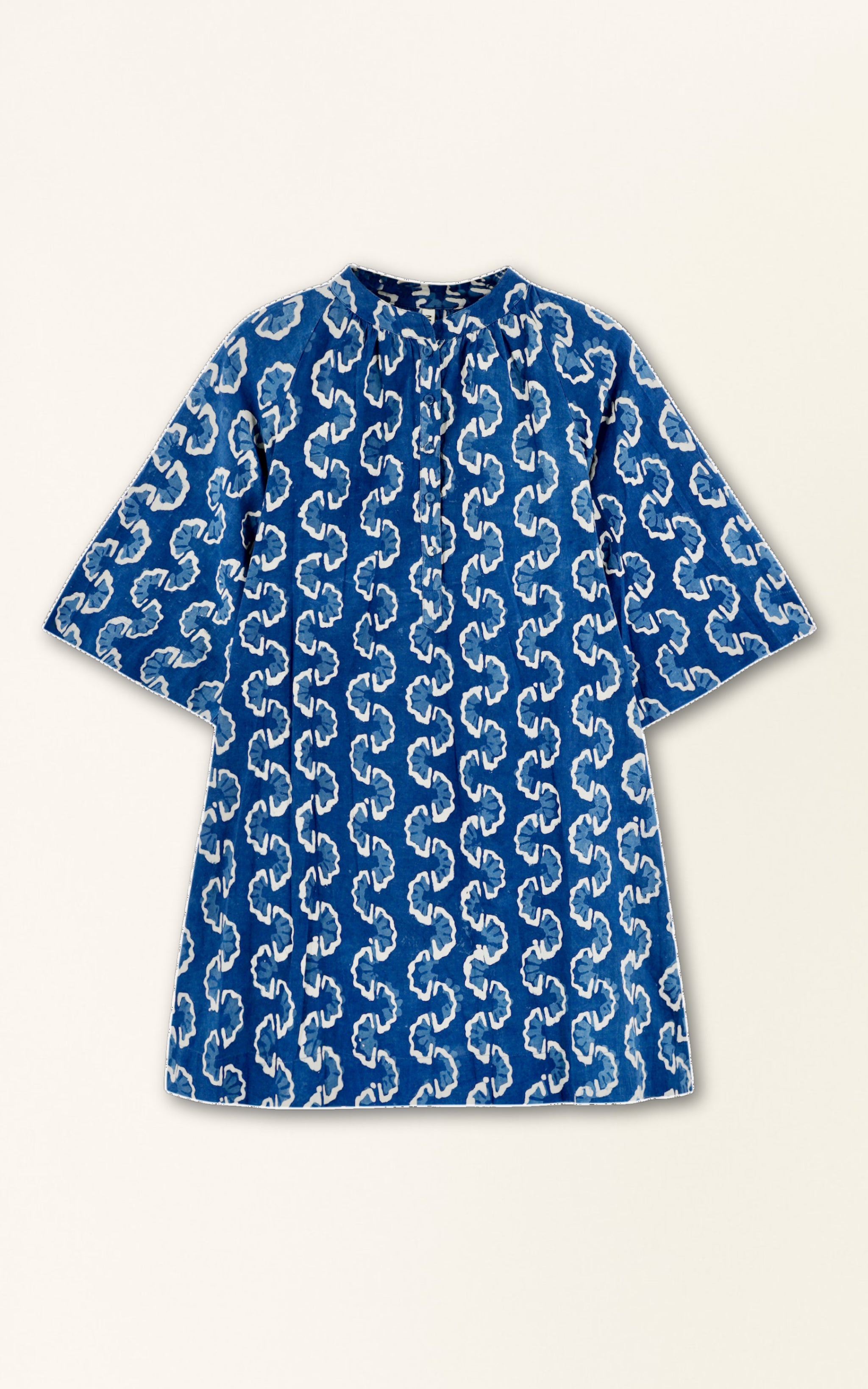 - Short dress with banded neck collar made with fabric hand block printed using natural indigo dye