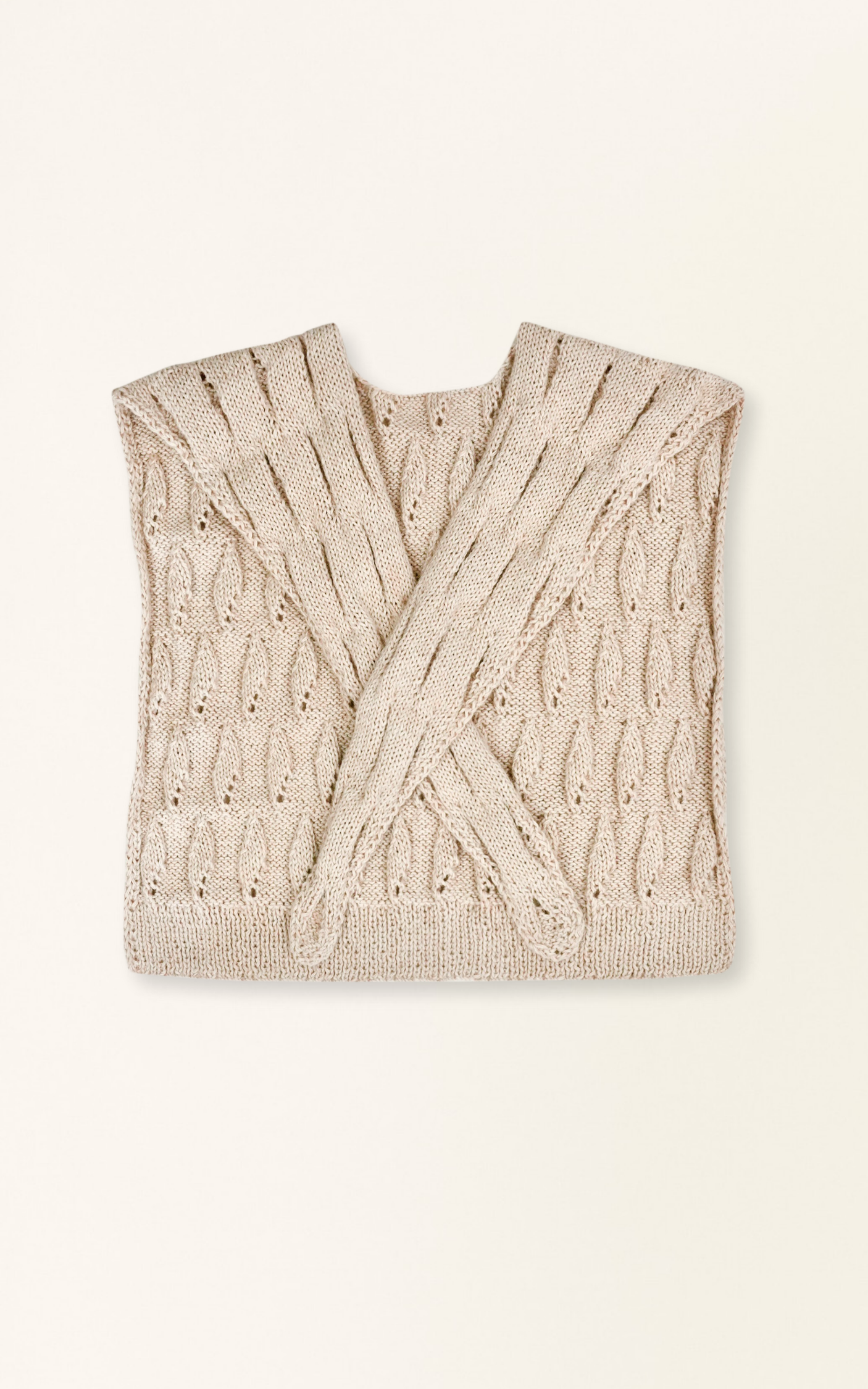 - Hand knit shawl shaped to drape on shoulders and tie in front