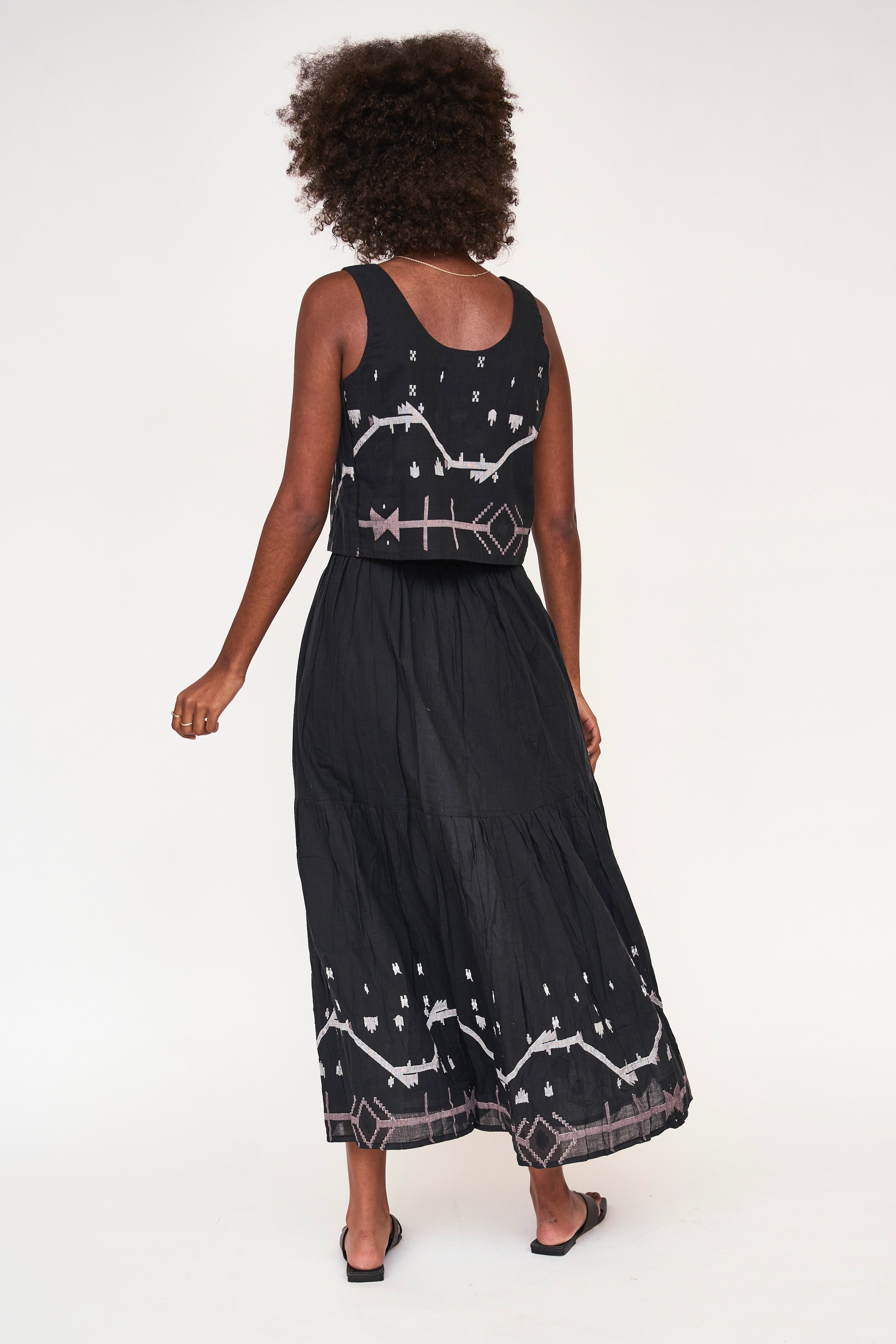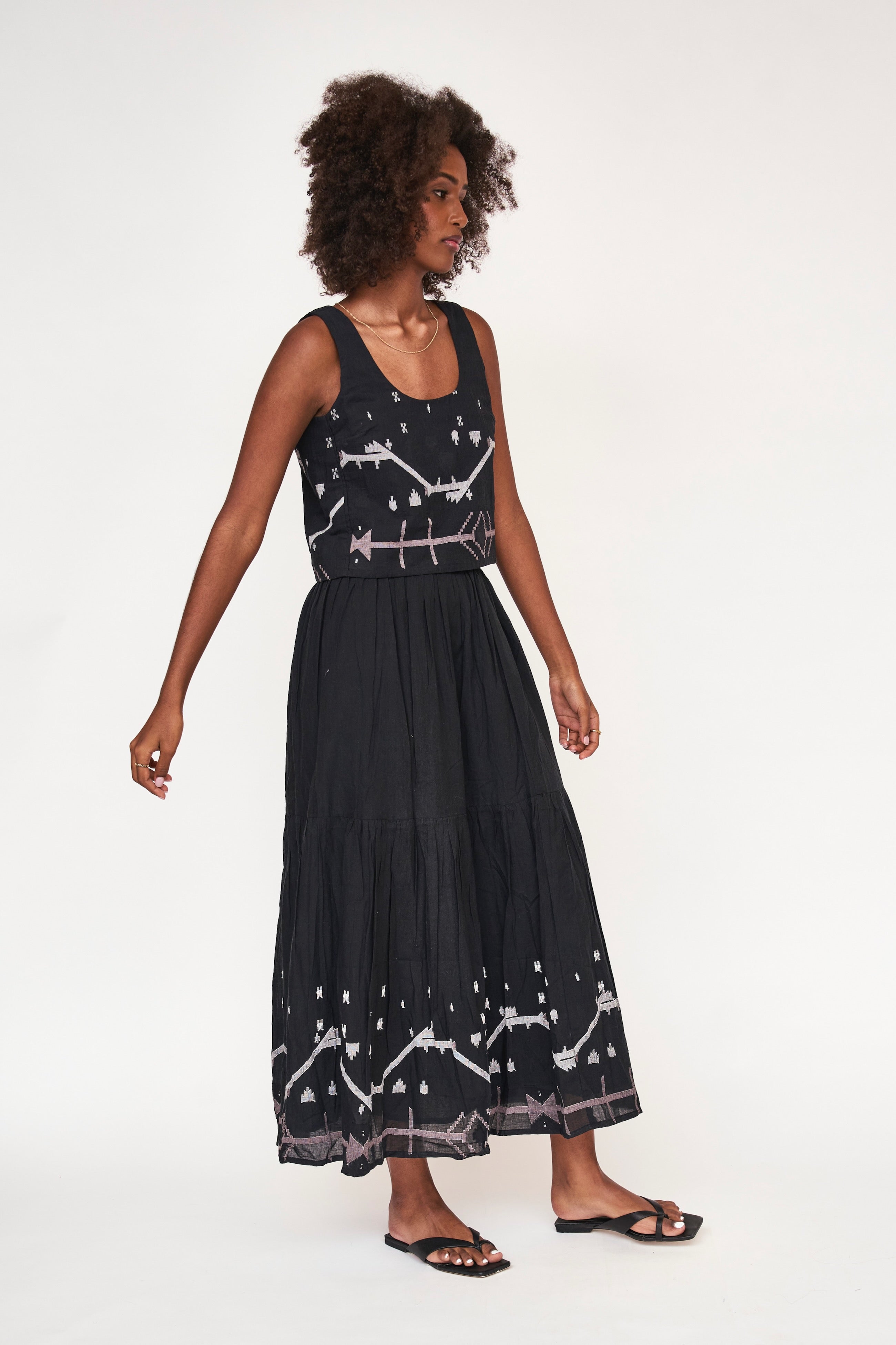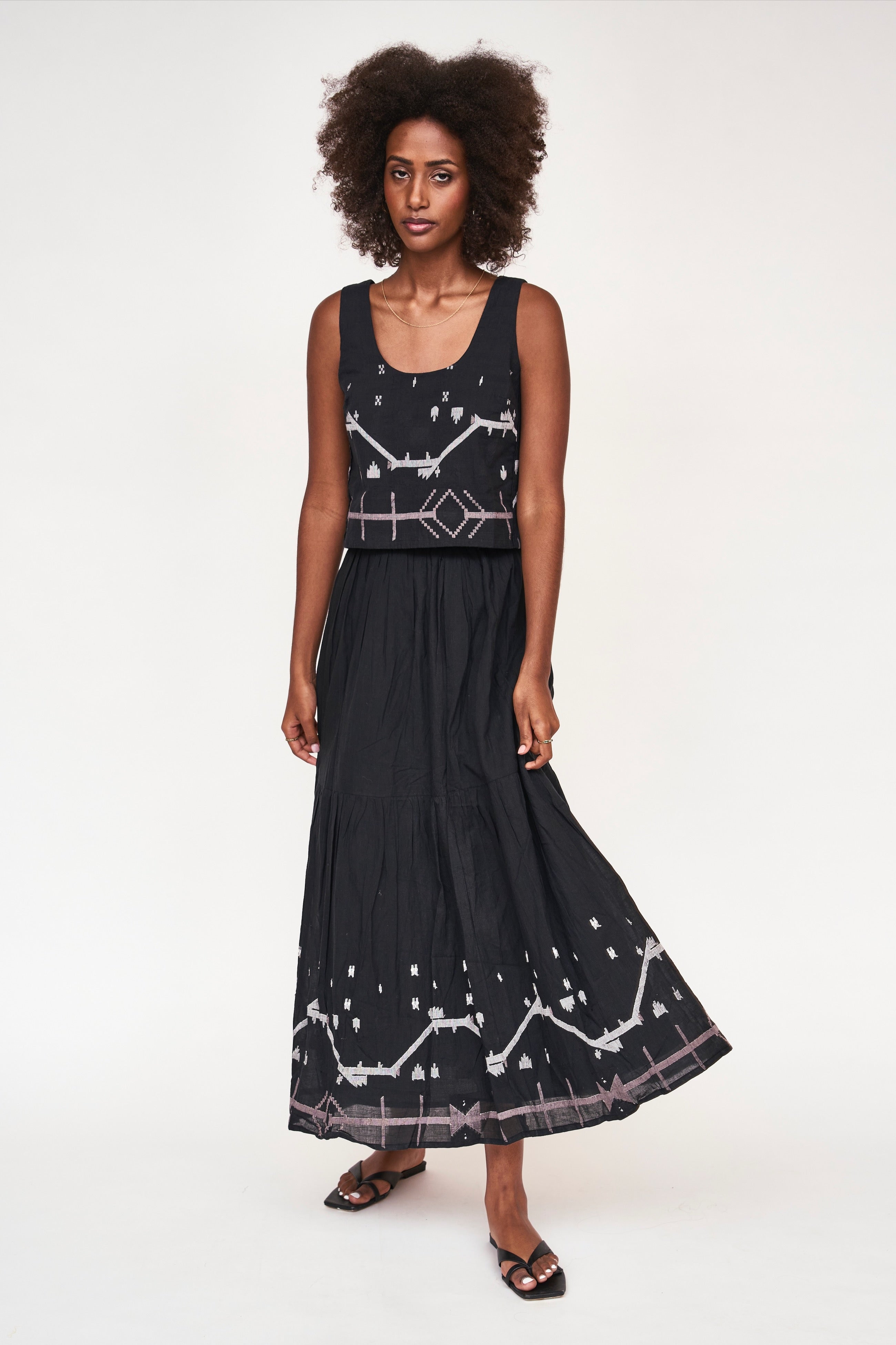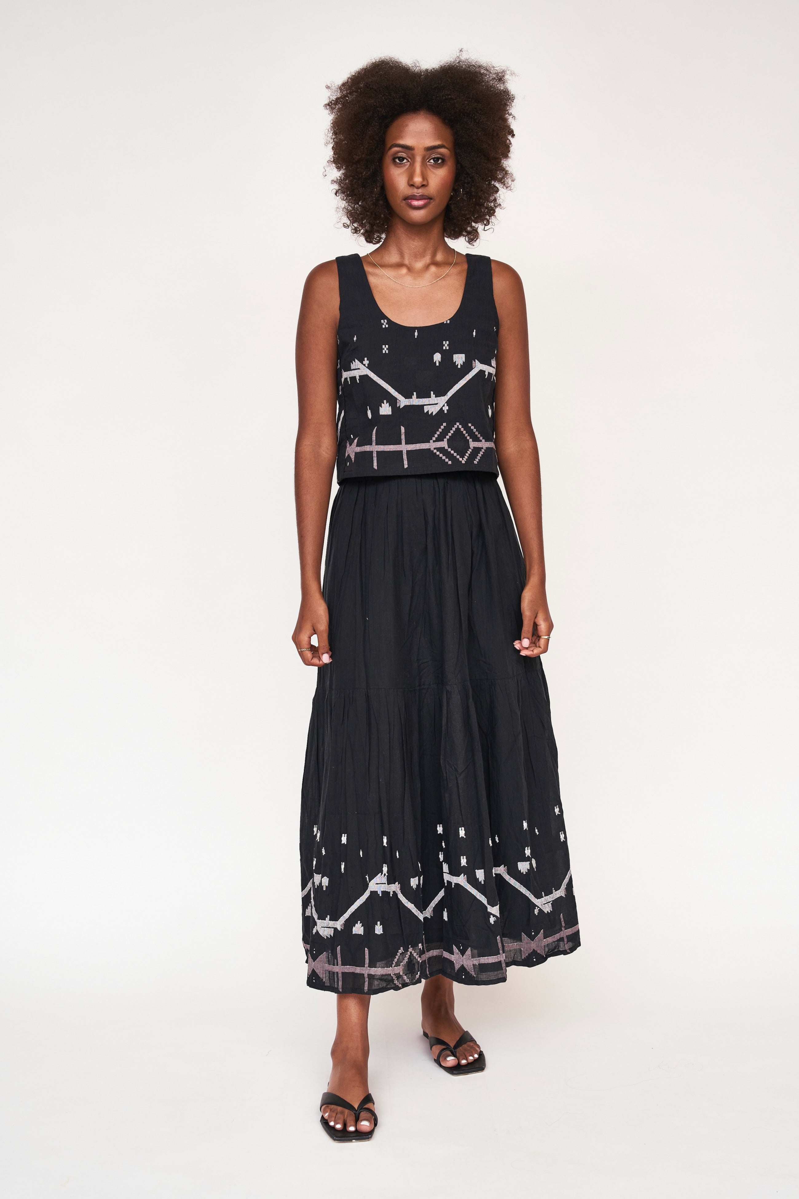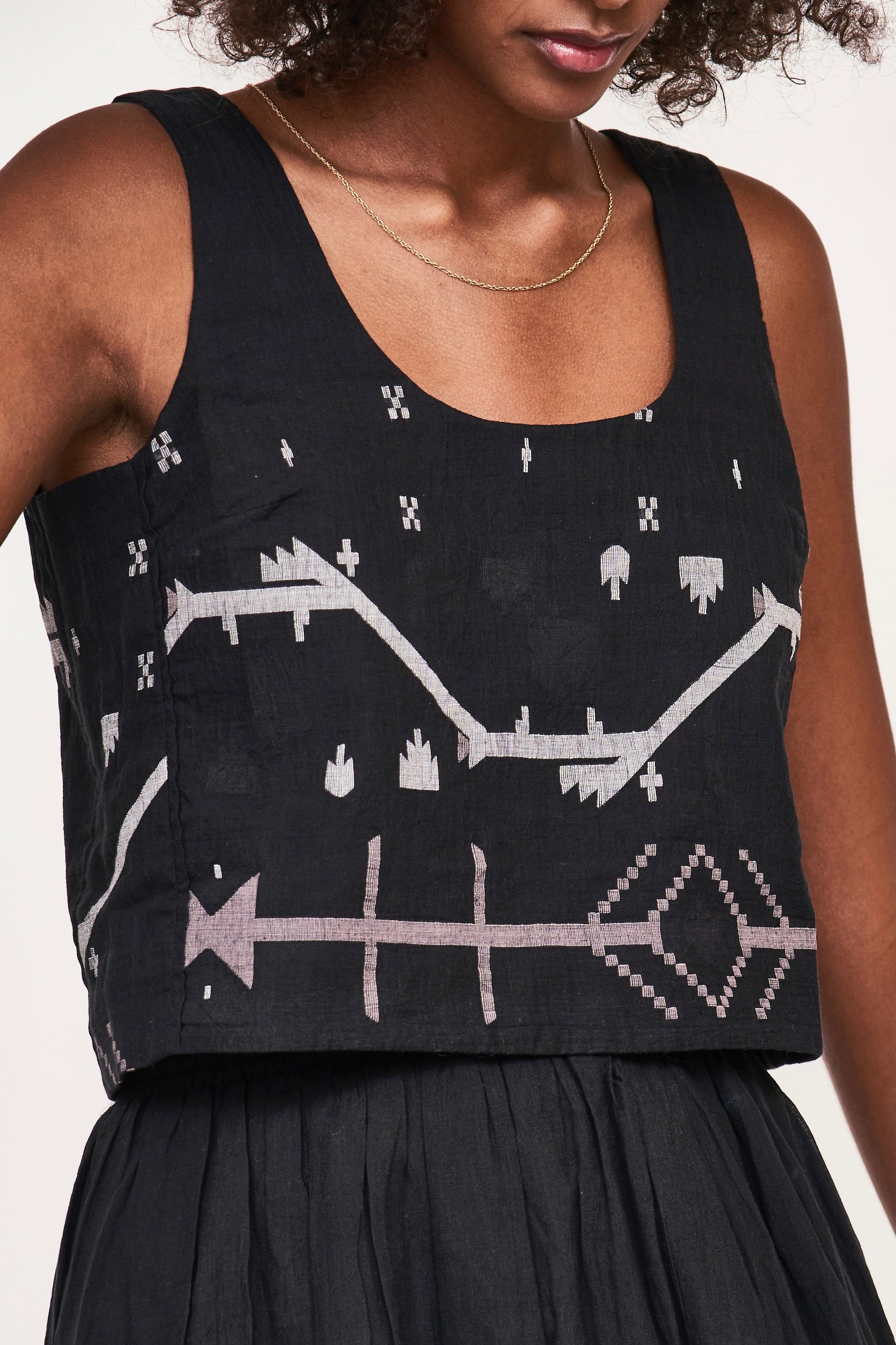 this casual tank is made sophisticated with delicate jamdani details. pairs with our matching paros skirt.