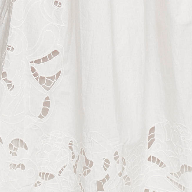 - Large scale Schiffli cutwork embroidery at bottom hem and sleeve openings