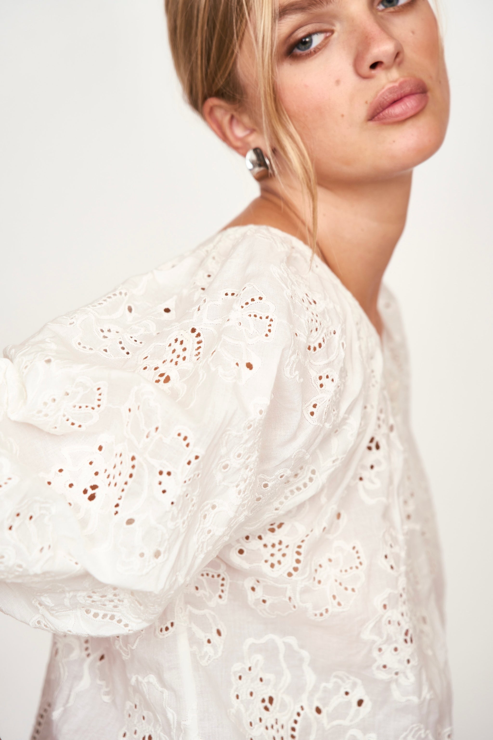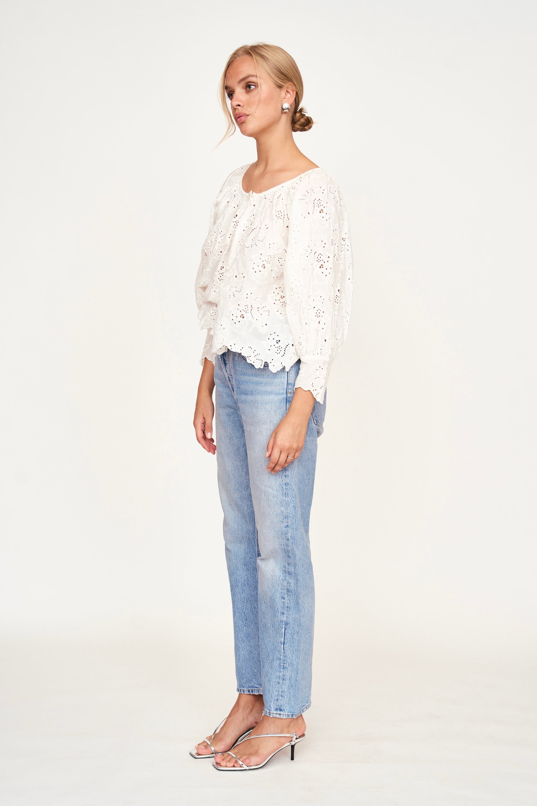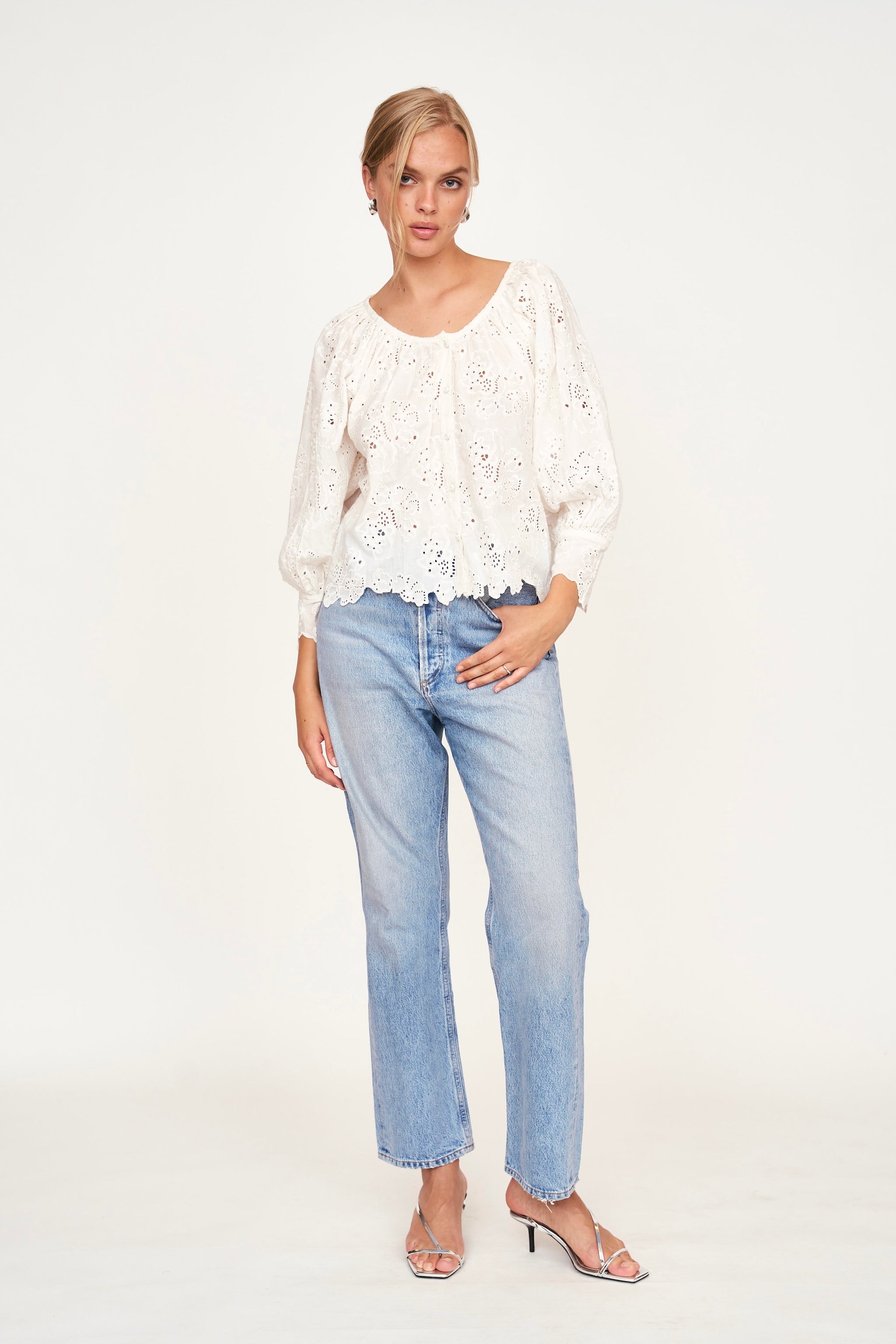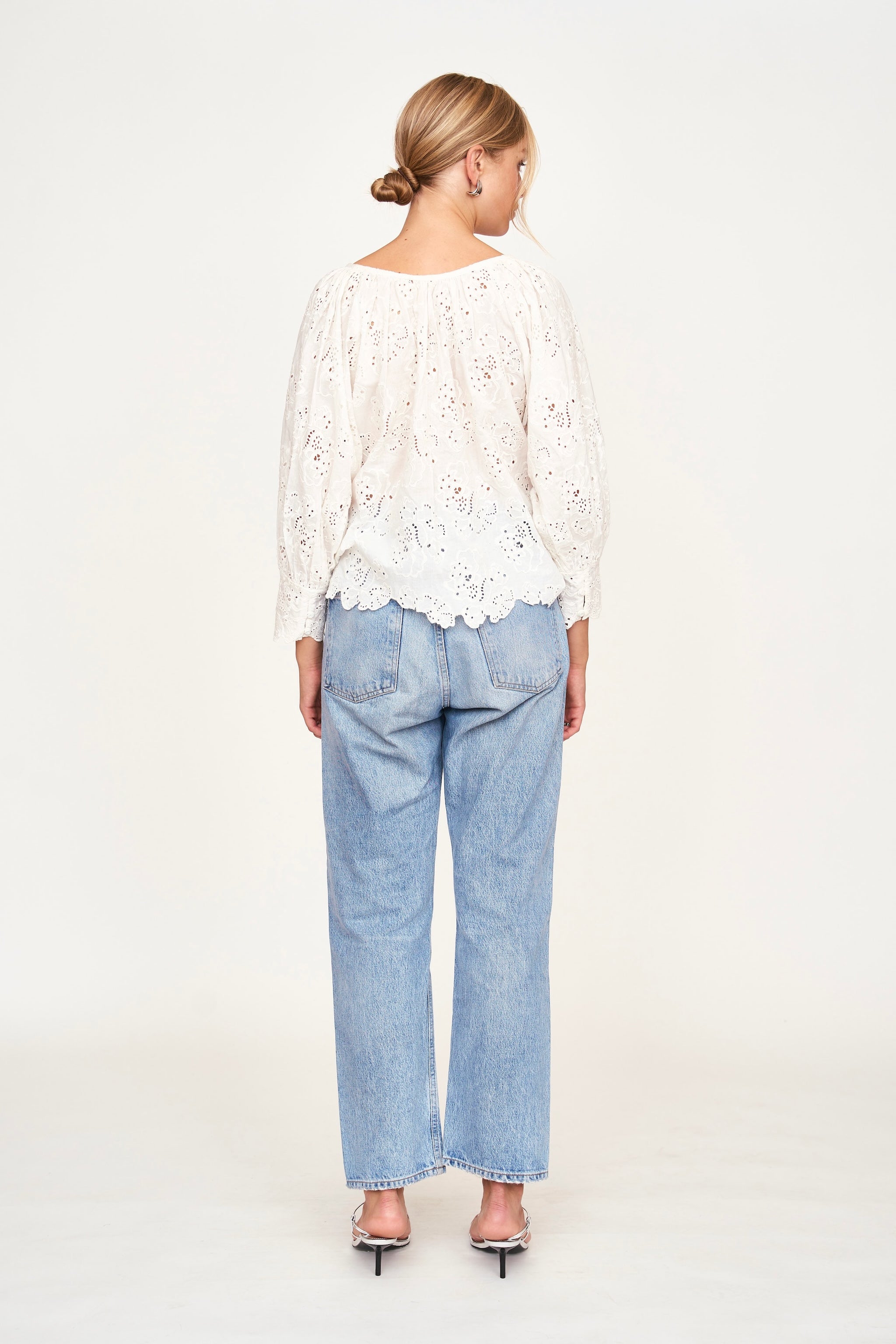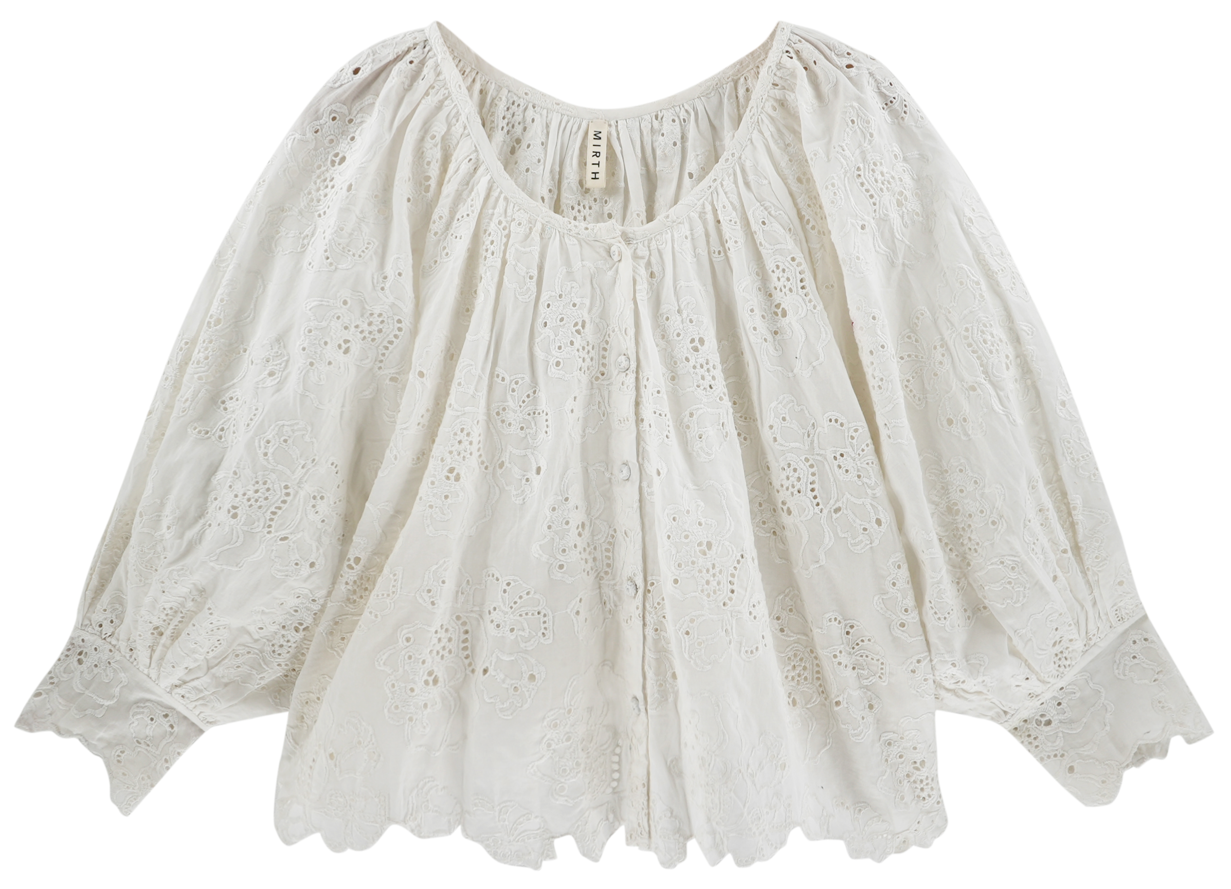- Eyelet blouse with scoop neckline in front and back