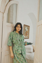 - Hand screen printed shawl collar cotton robe