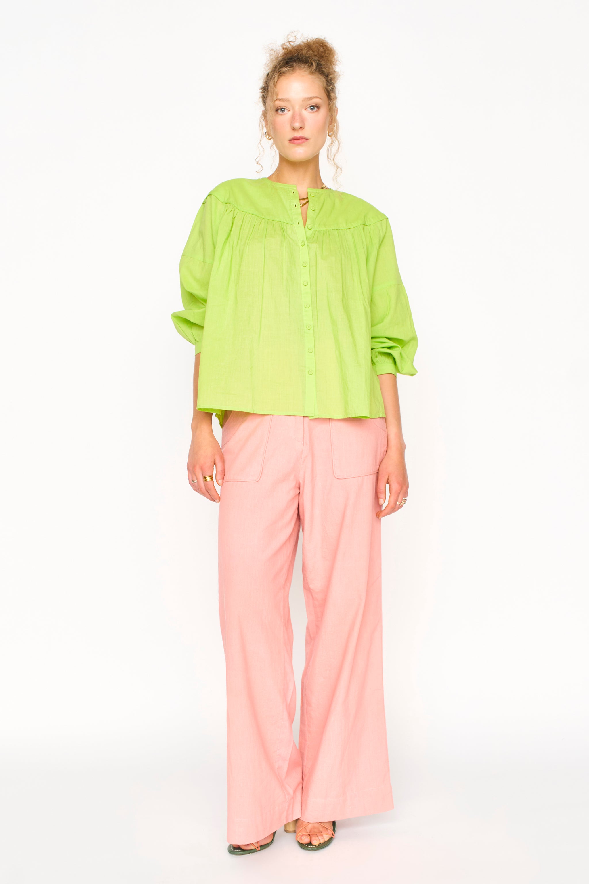 • Styled with our Lucia Top, Kyoto Shirt (Lime Popova, Pomelo) and Oslo Blouse