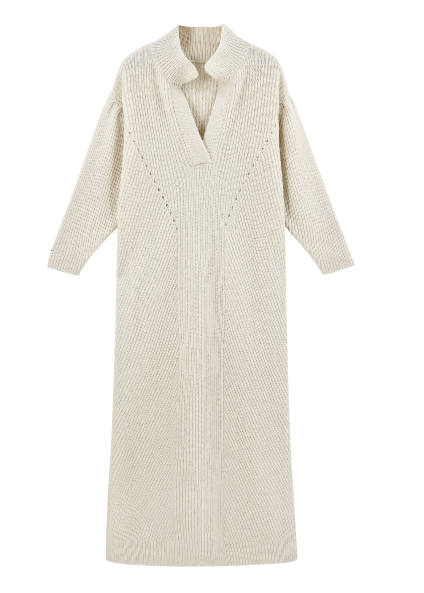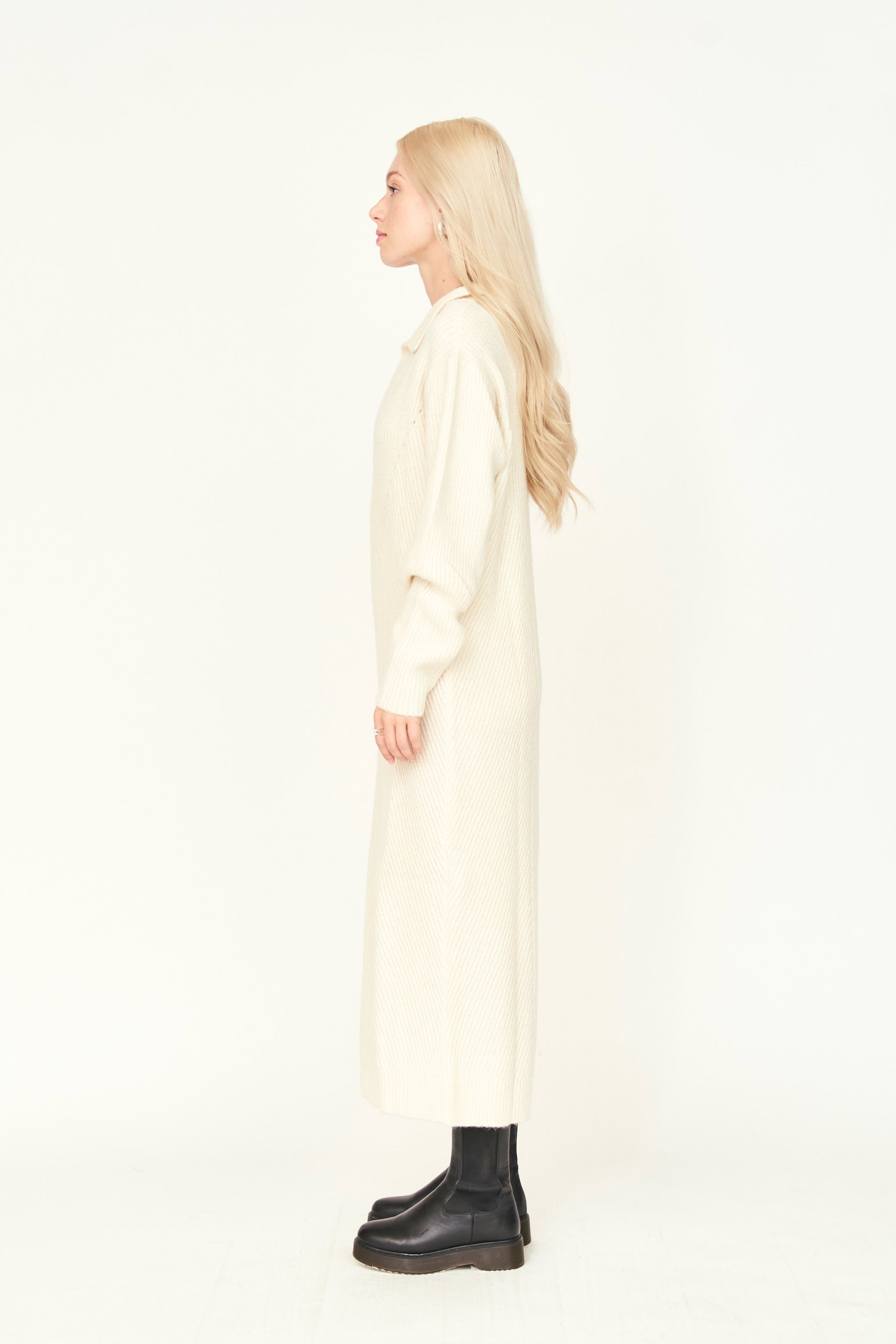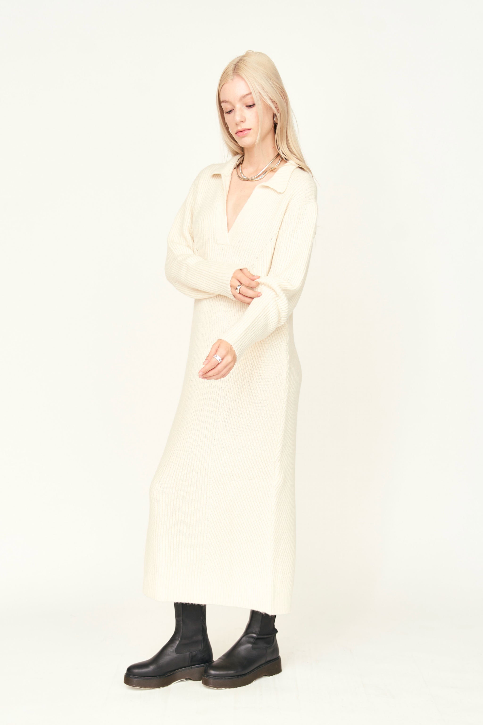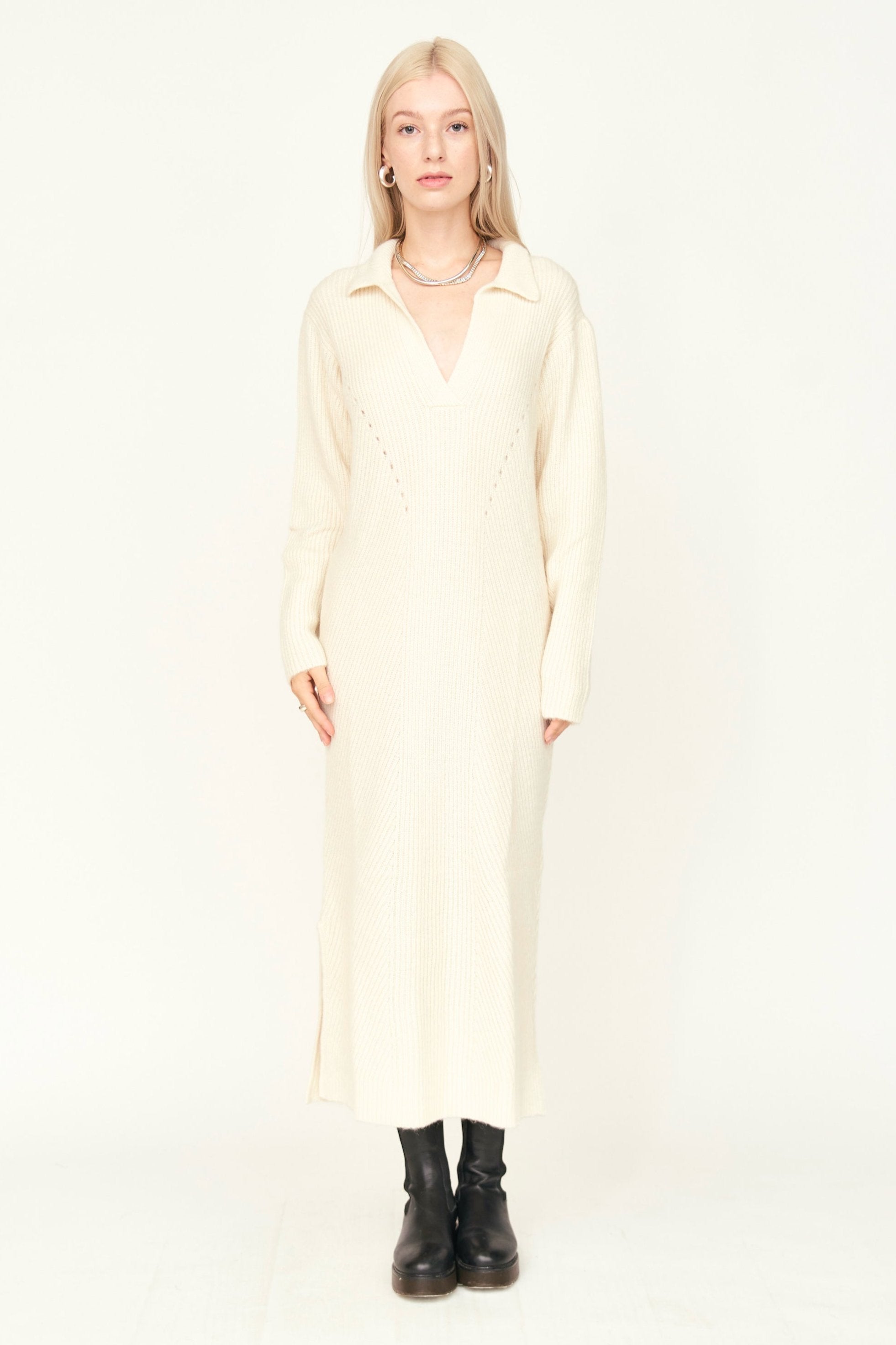 - Straight fit sweater dress with deep neckline and collar