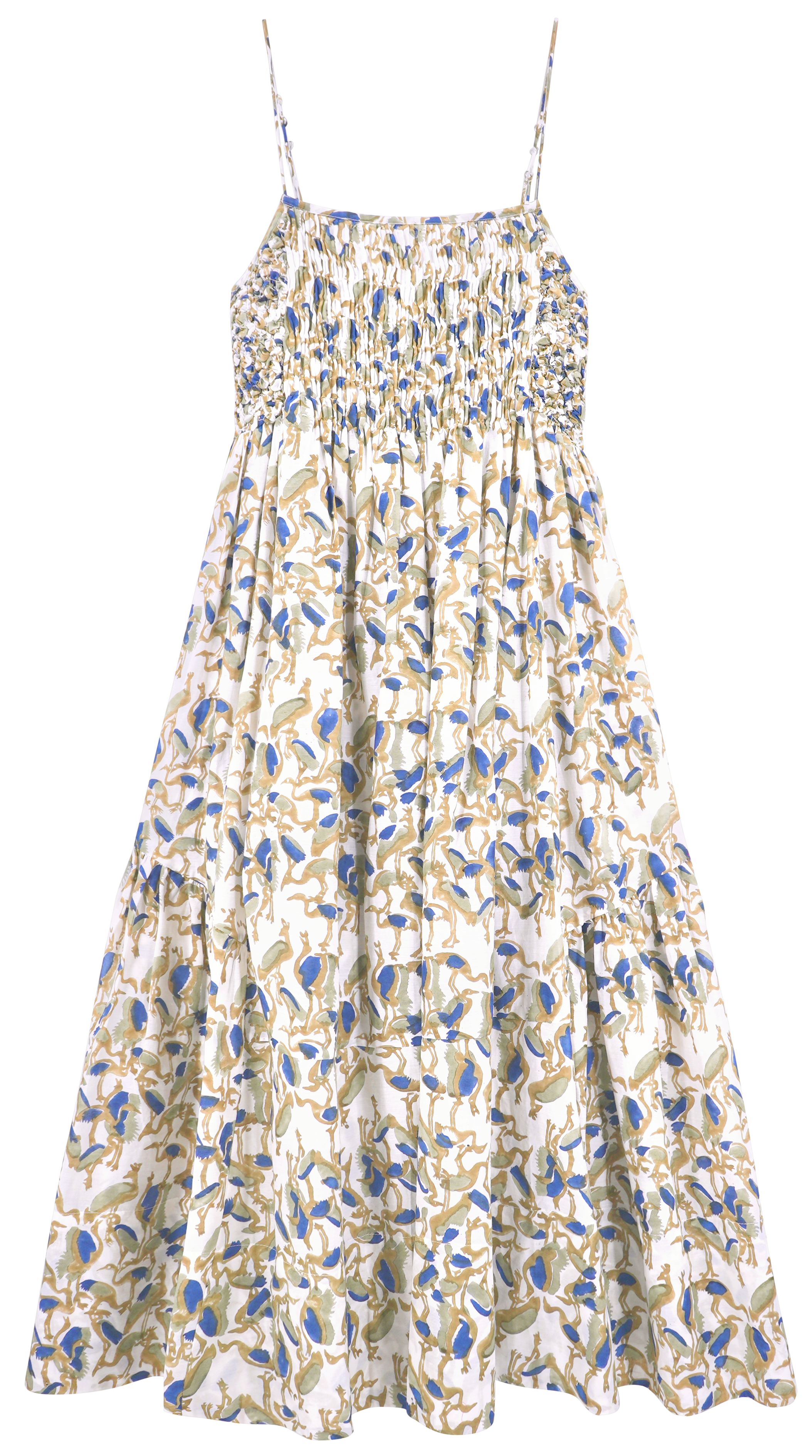- Midi length dress with smocked and cartridge pleat elastic bodice