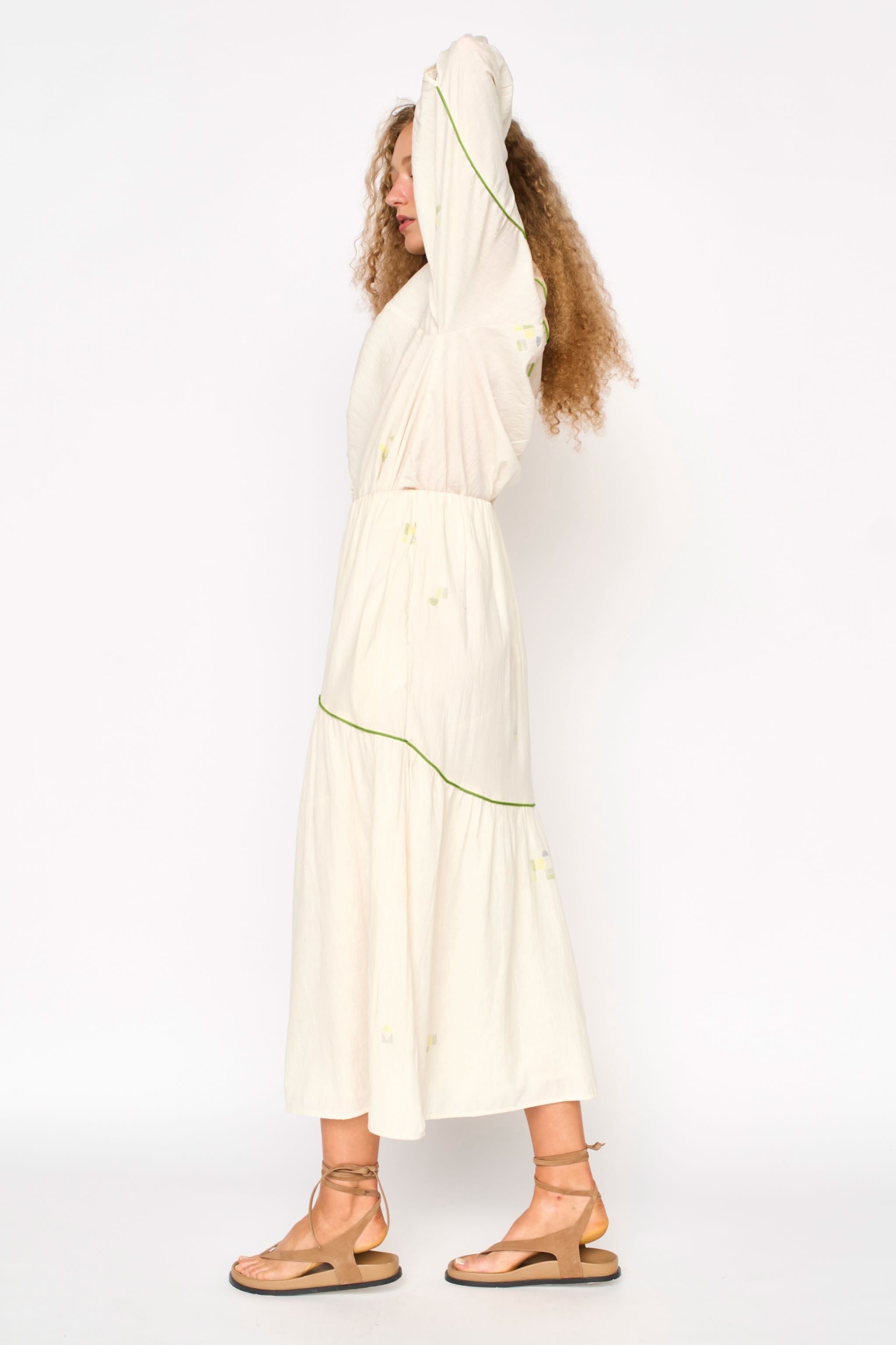 - Softly gathered long, tiered skirt
