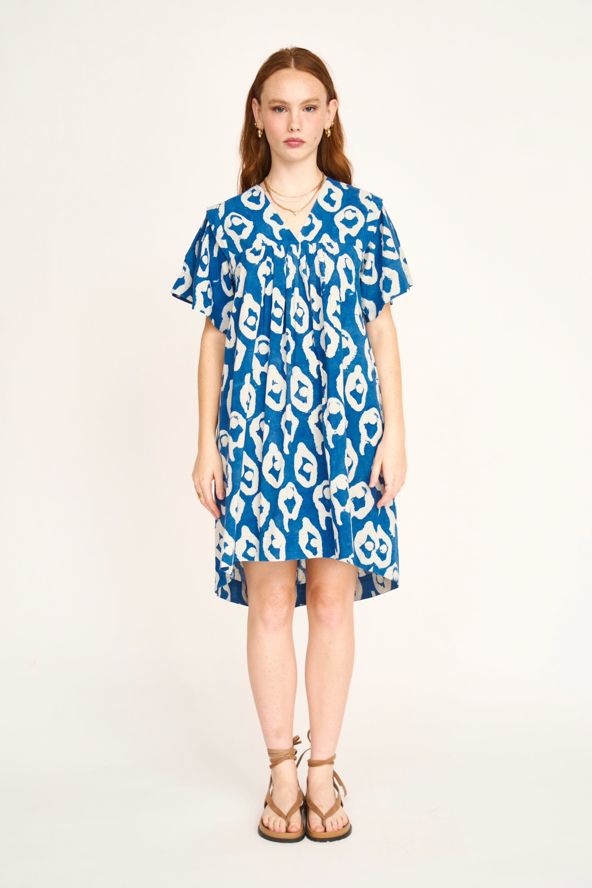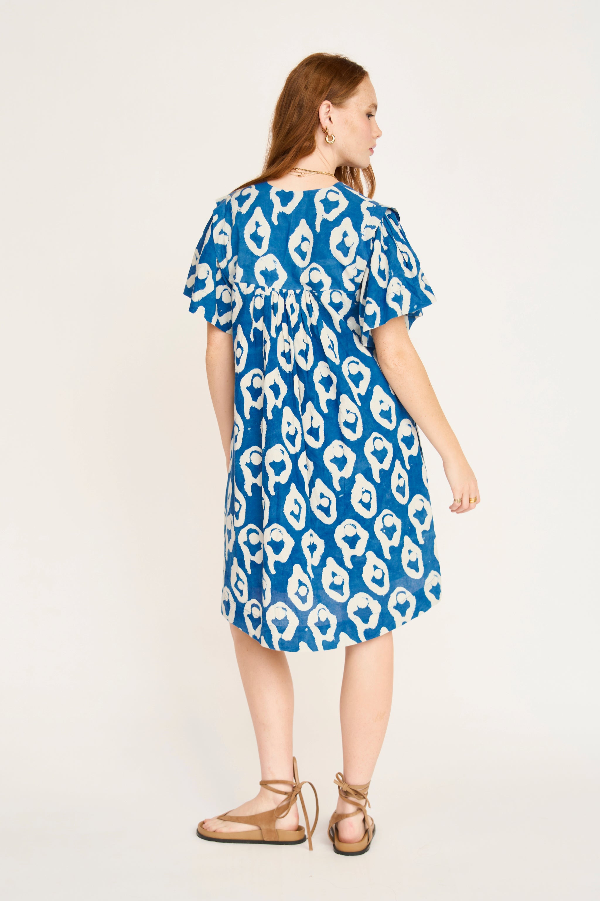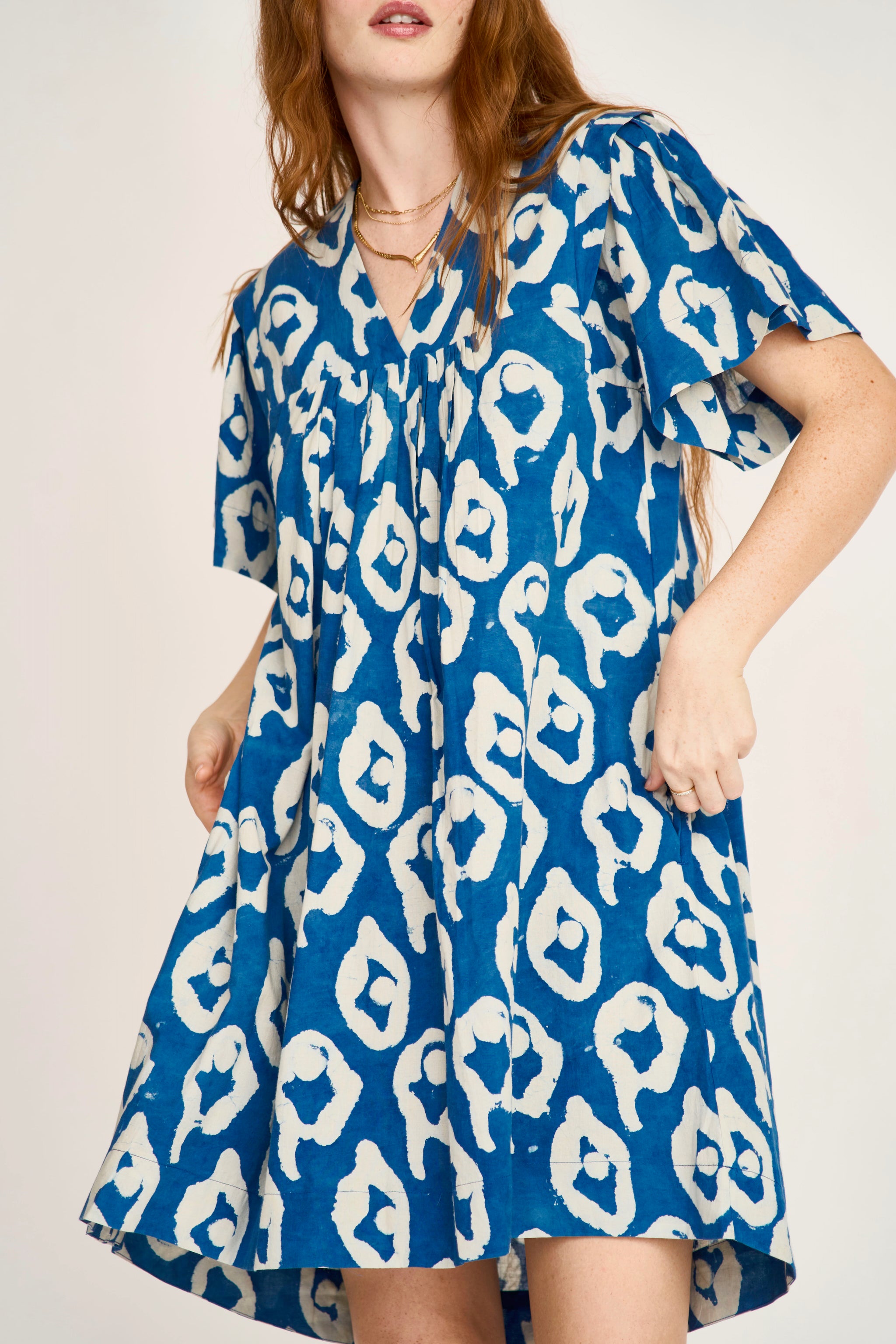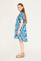 - Easy, above-the-knee dress made with fabric printed using natural indigo dye