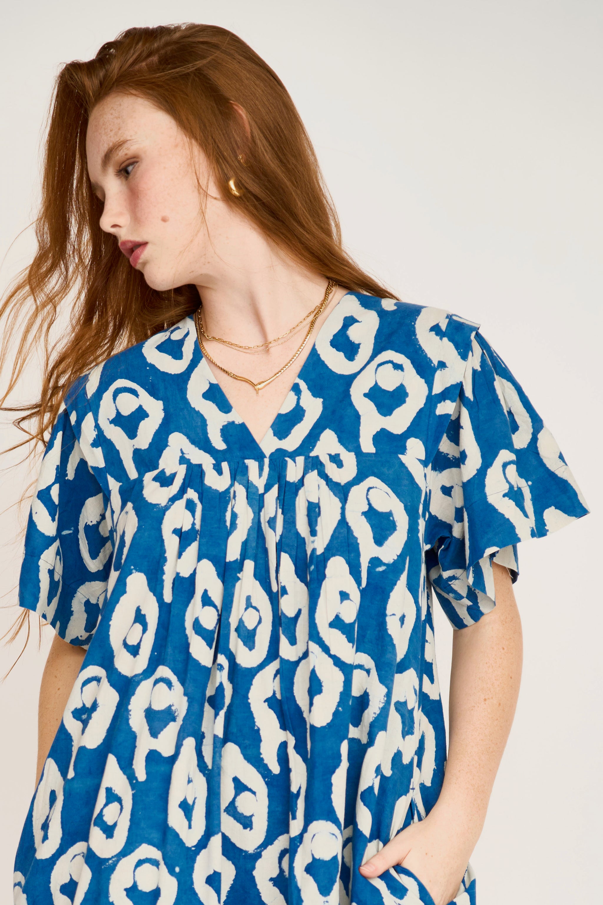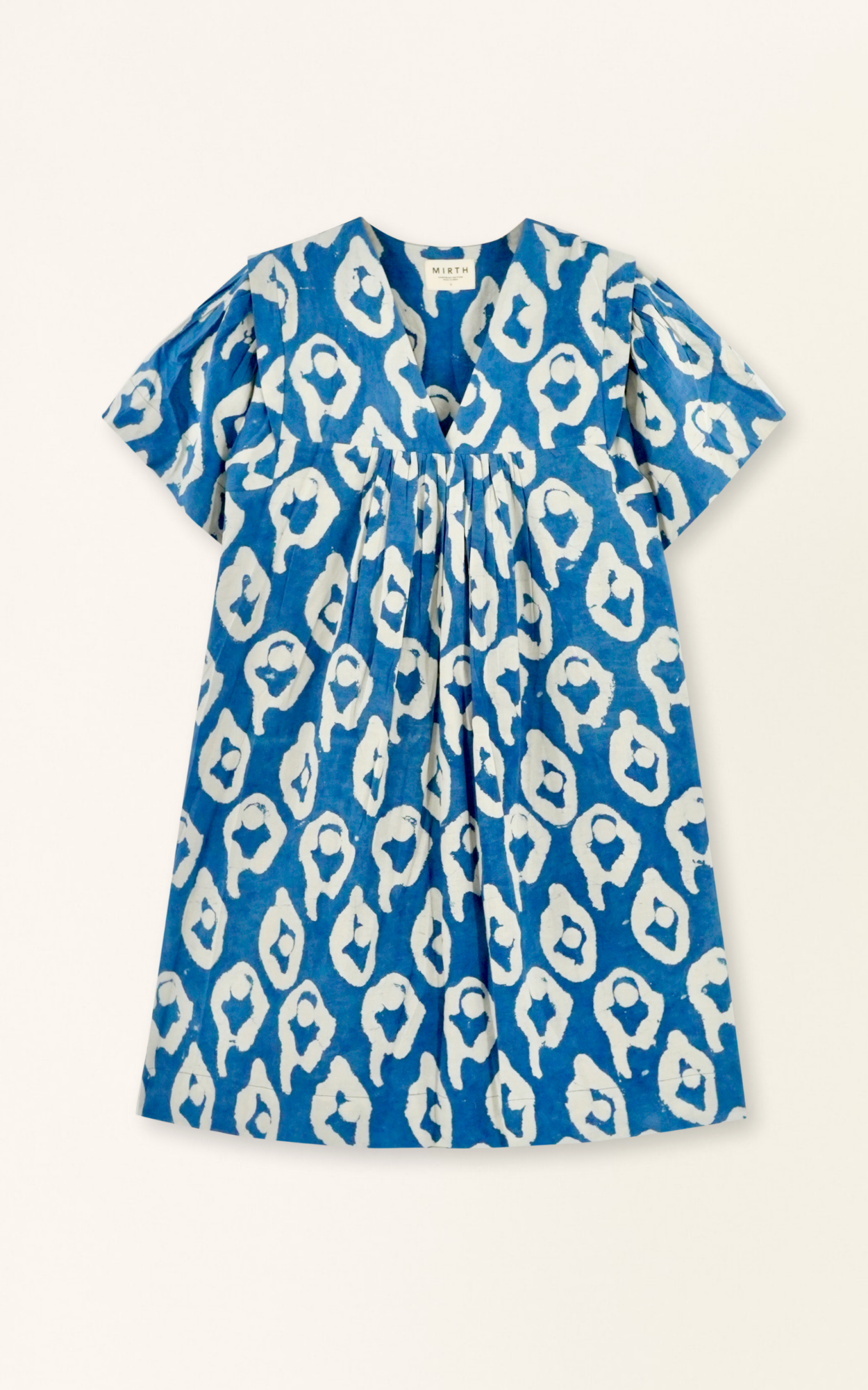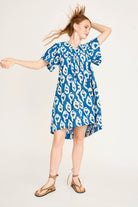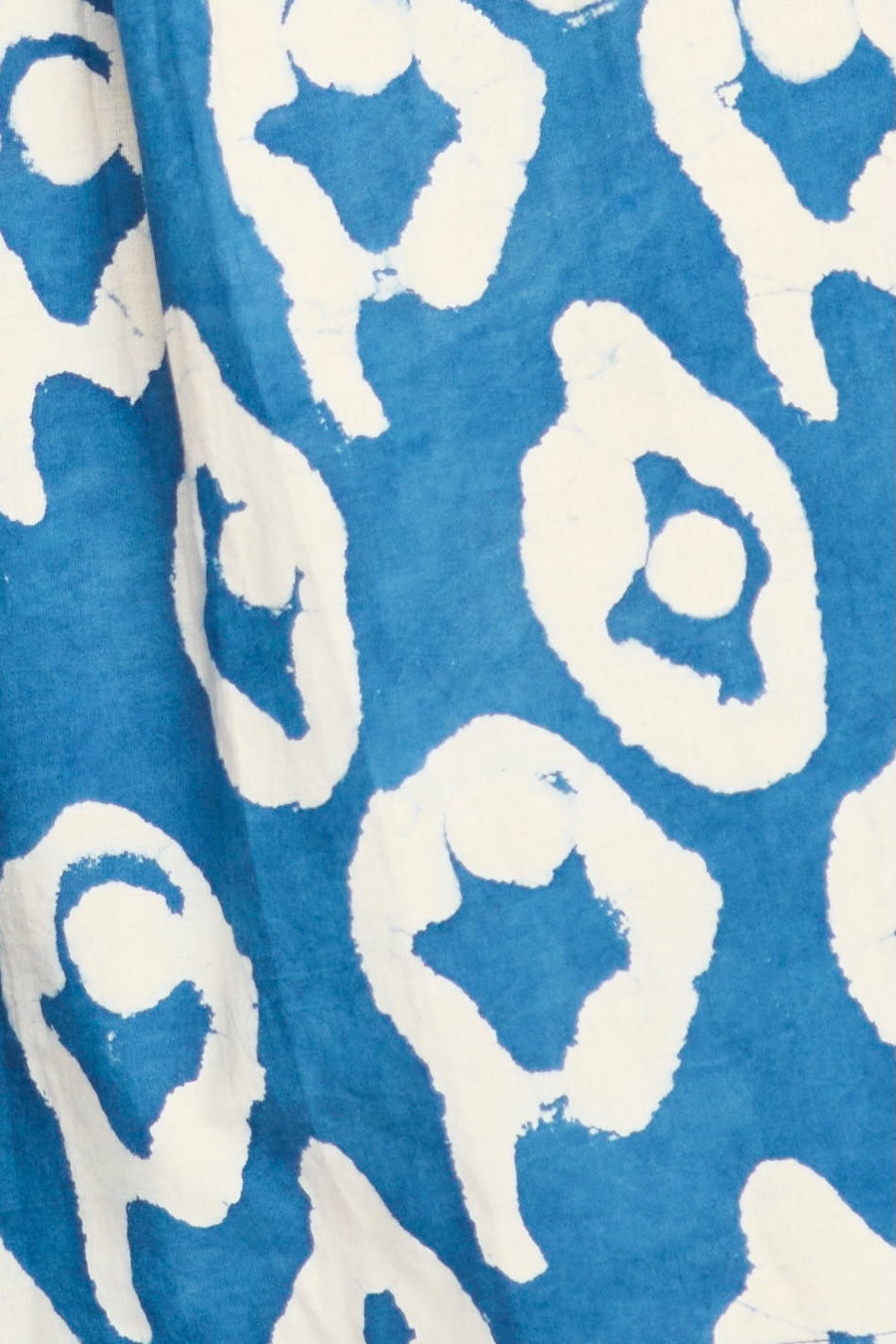 - Easy, above-the-knee dress made with fabric printed using natural indigo dye