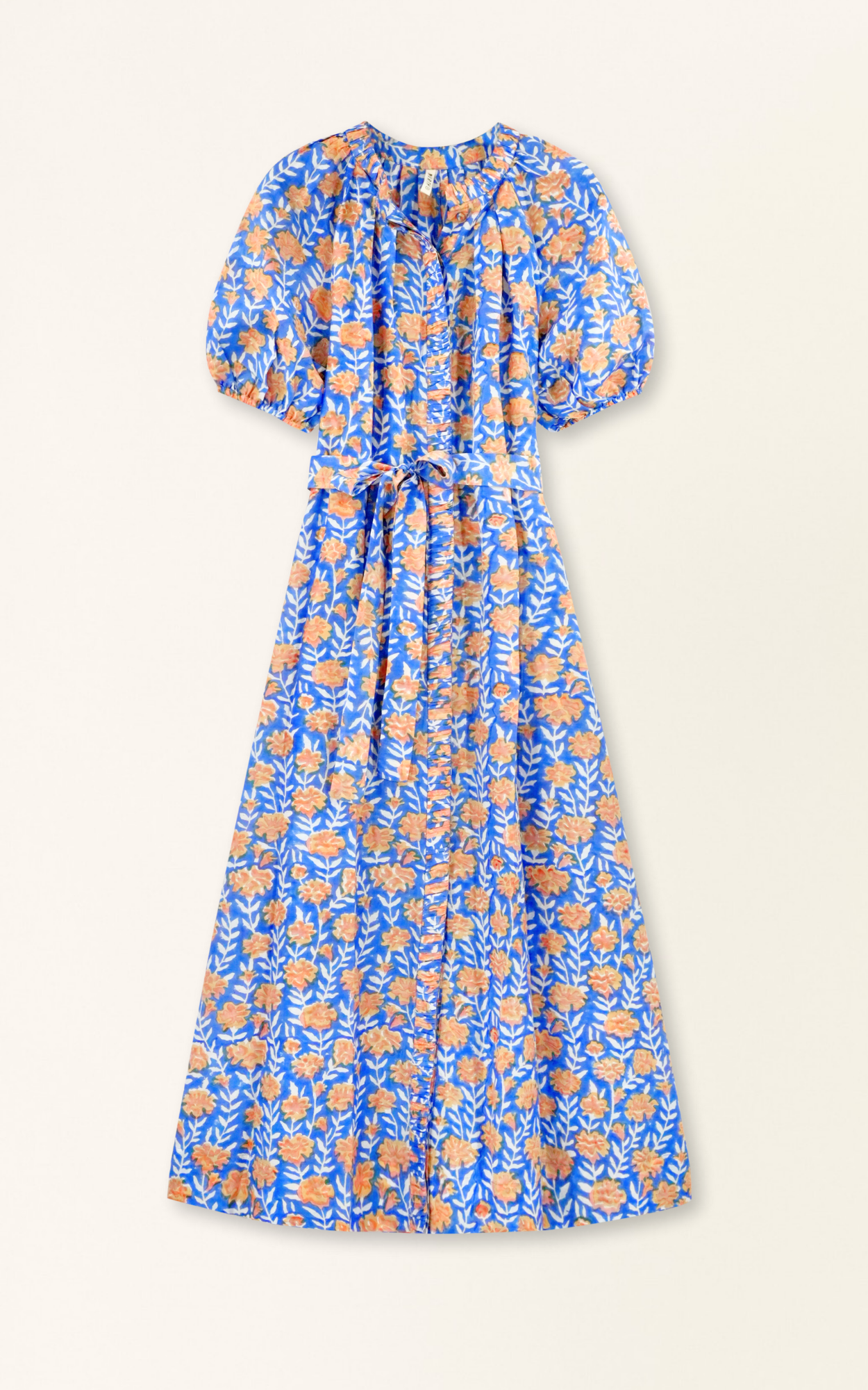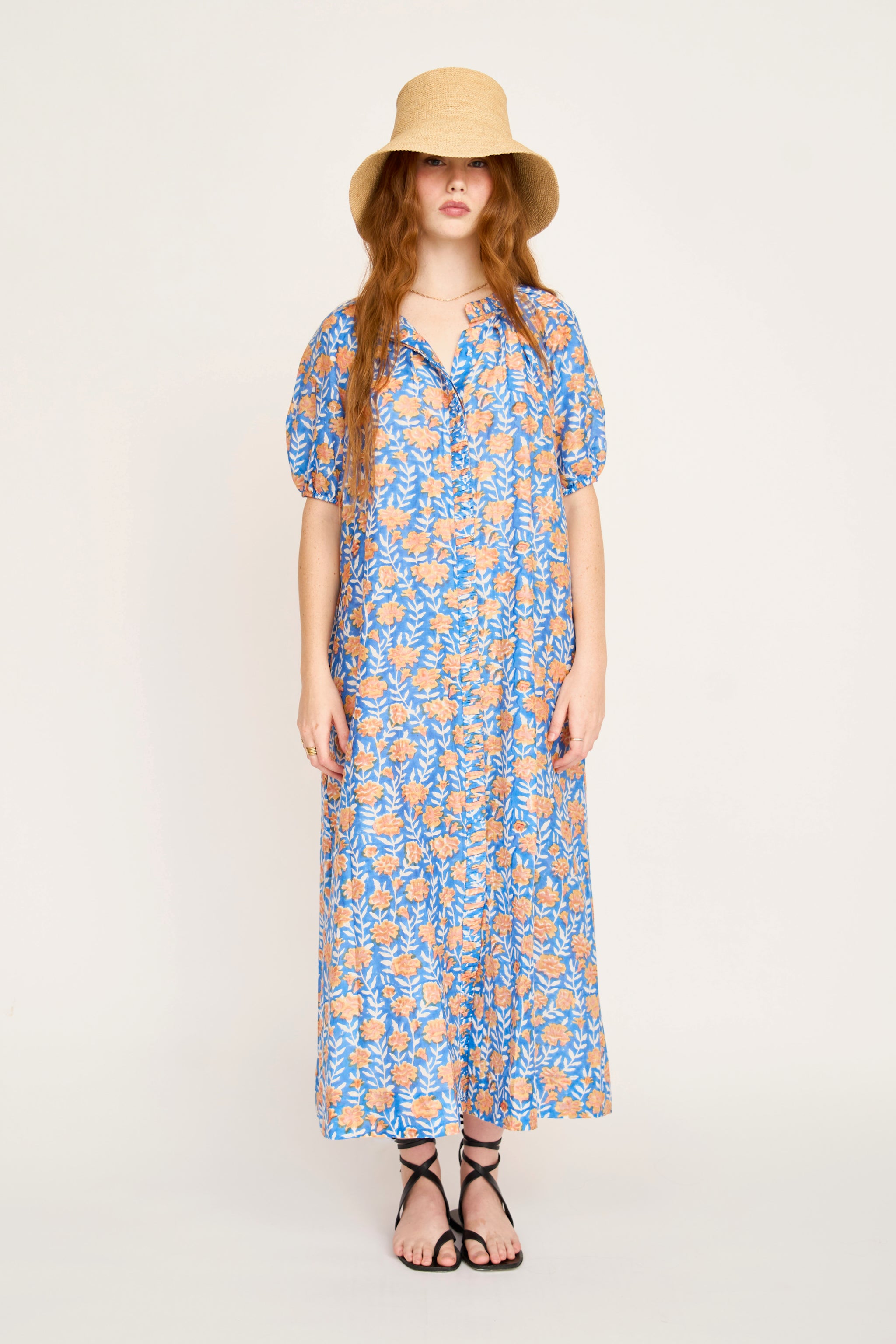- Ankle length, straight dress with front covered button placket
