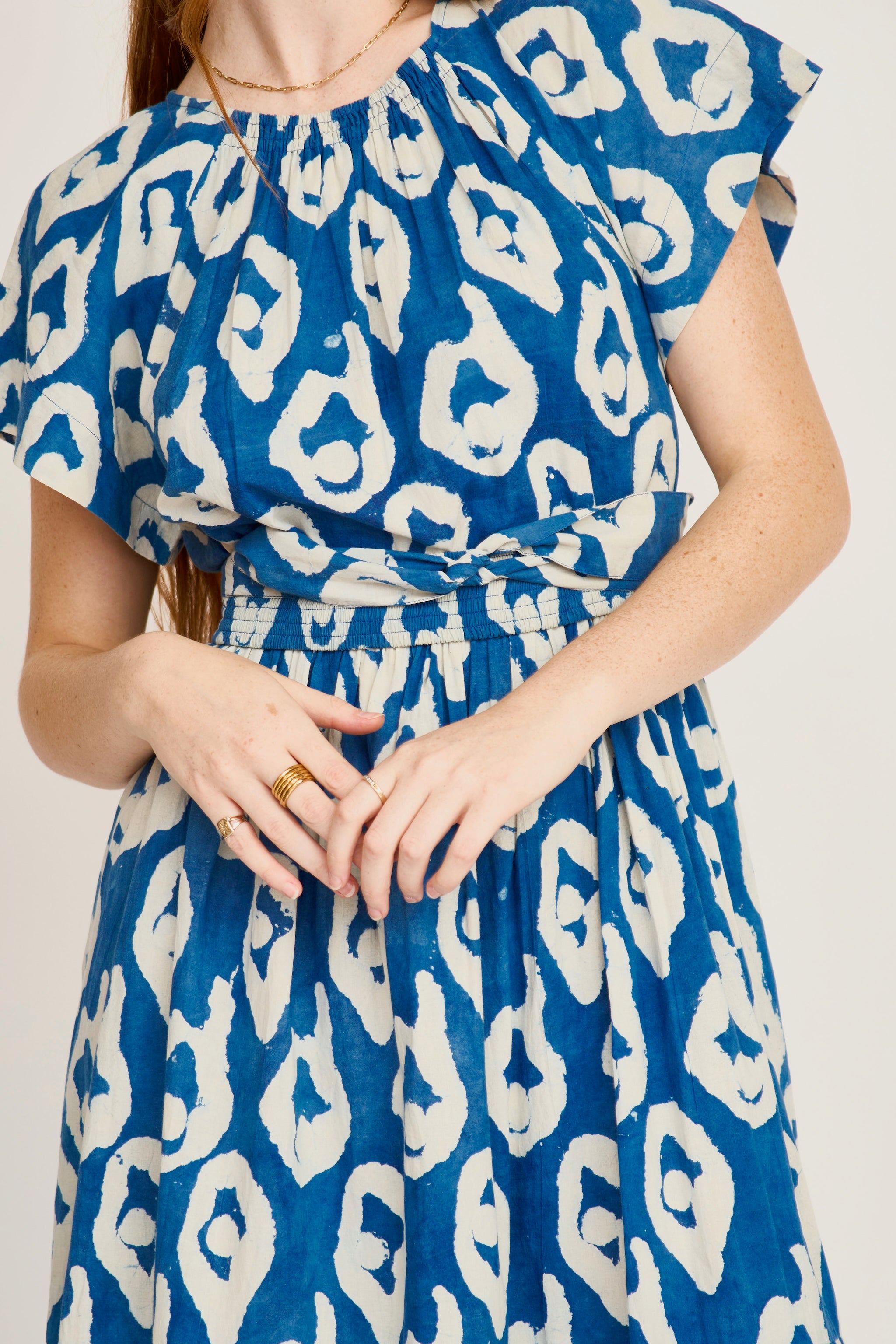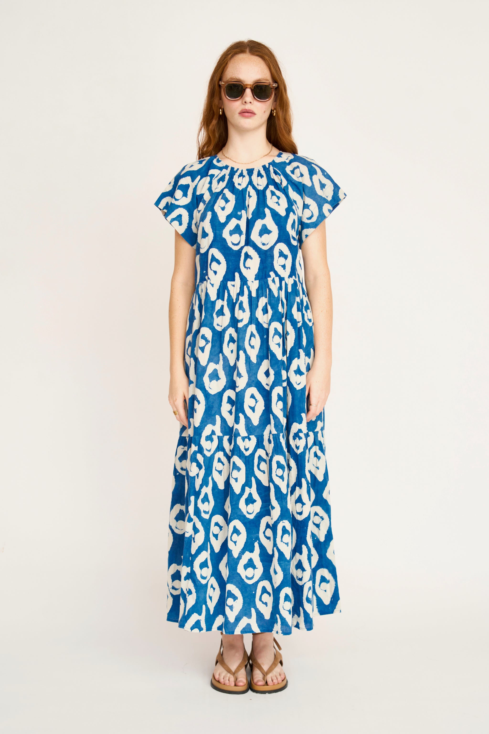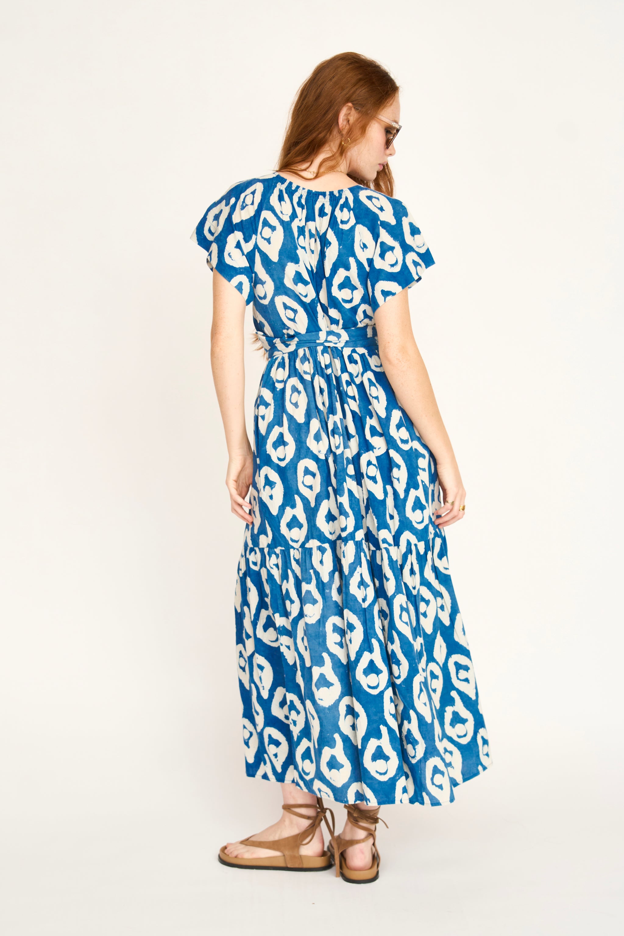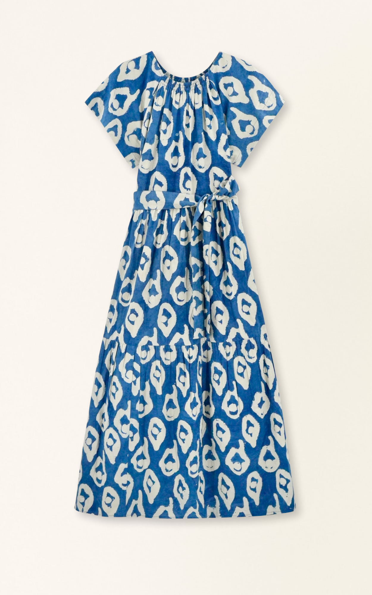 - Tiered ankle length dress with ruched elastic neckline dyed with natural indigo dye