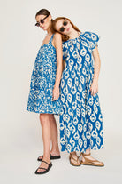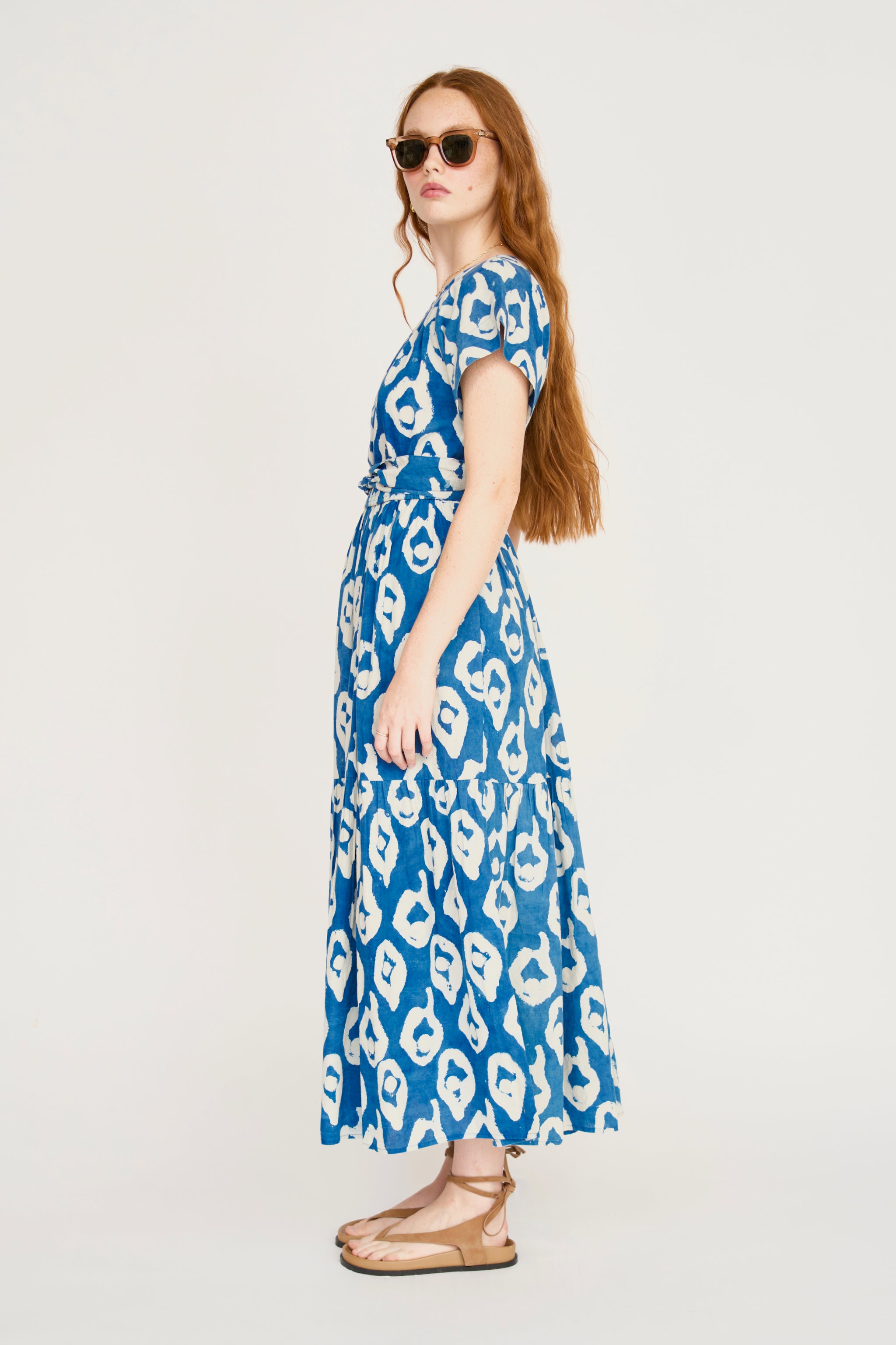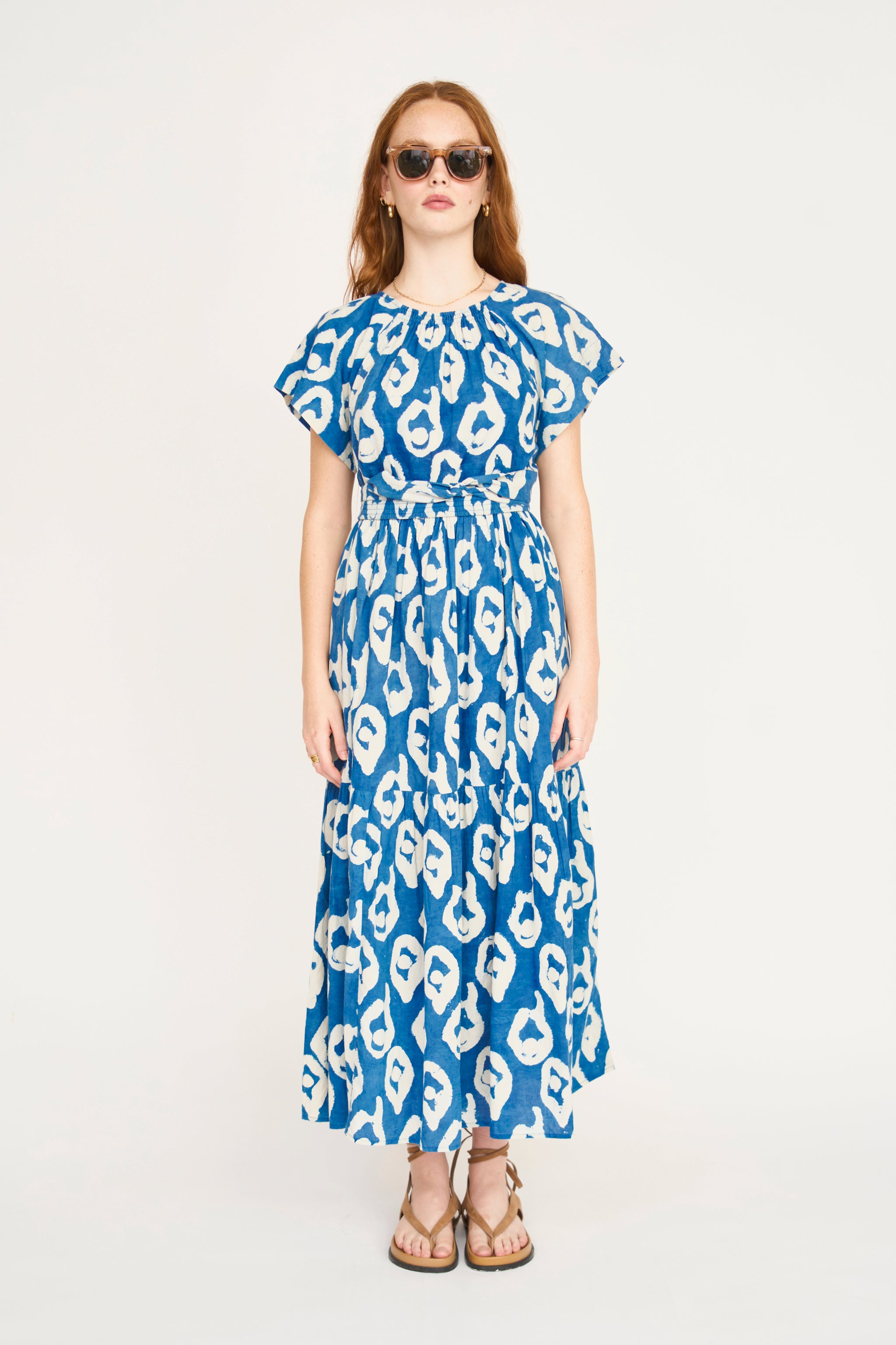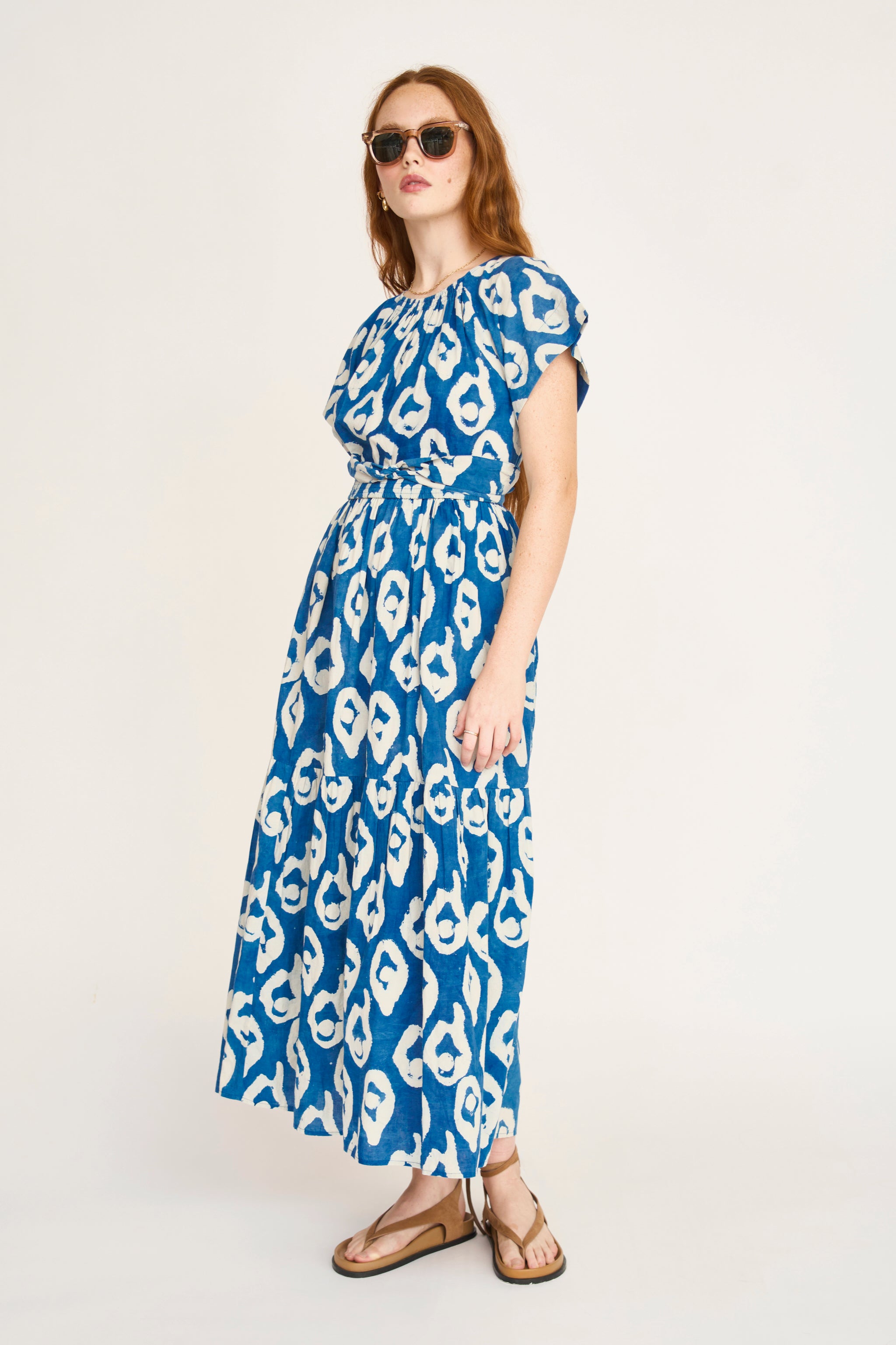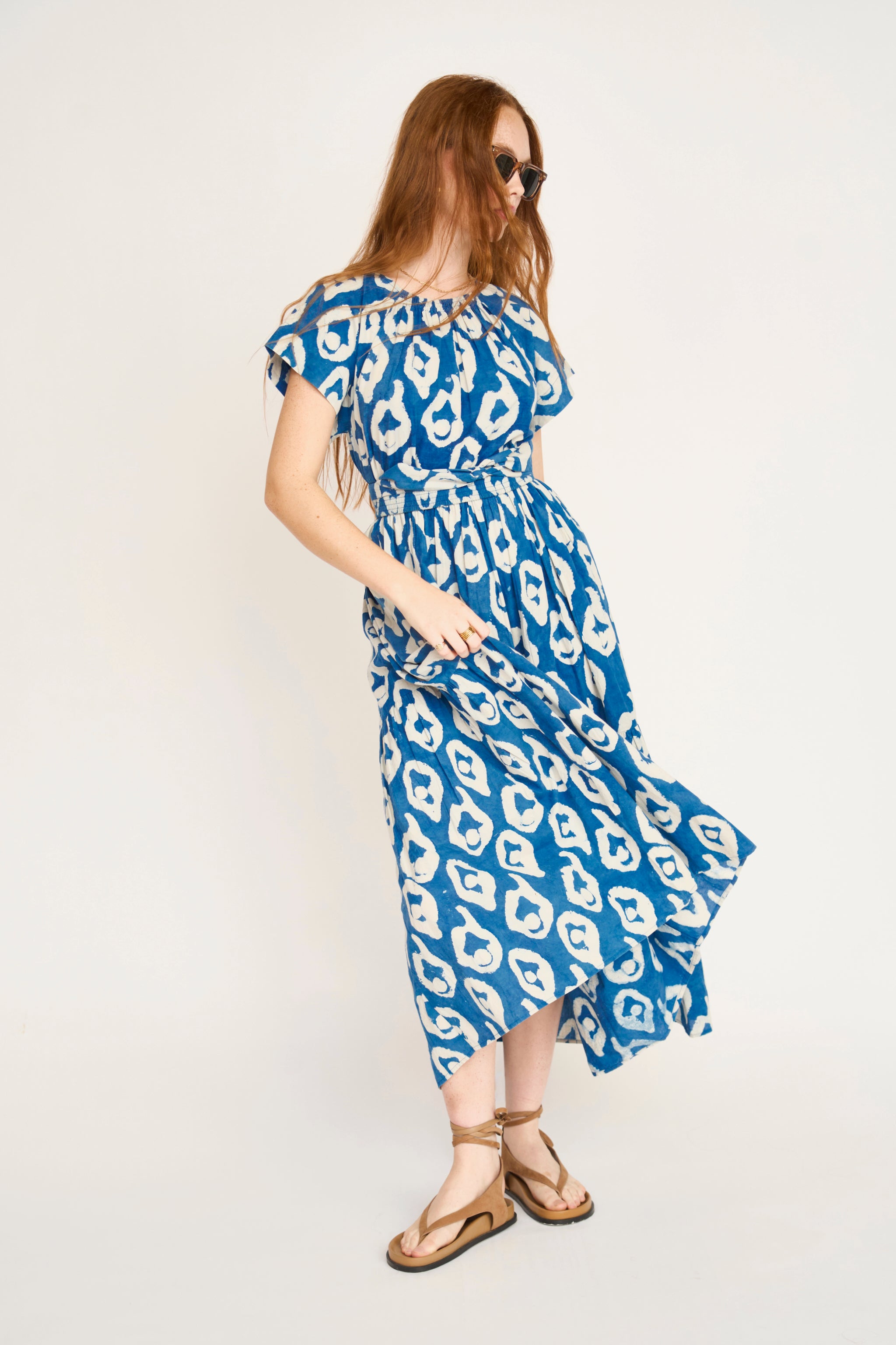 - Tiered ankle length dress with ruched elastic neckline dyed with natural indigo dye