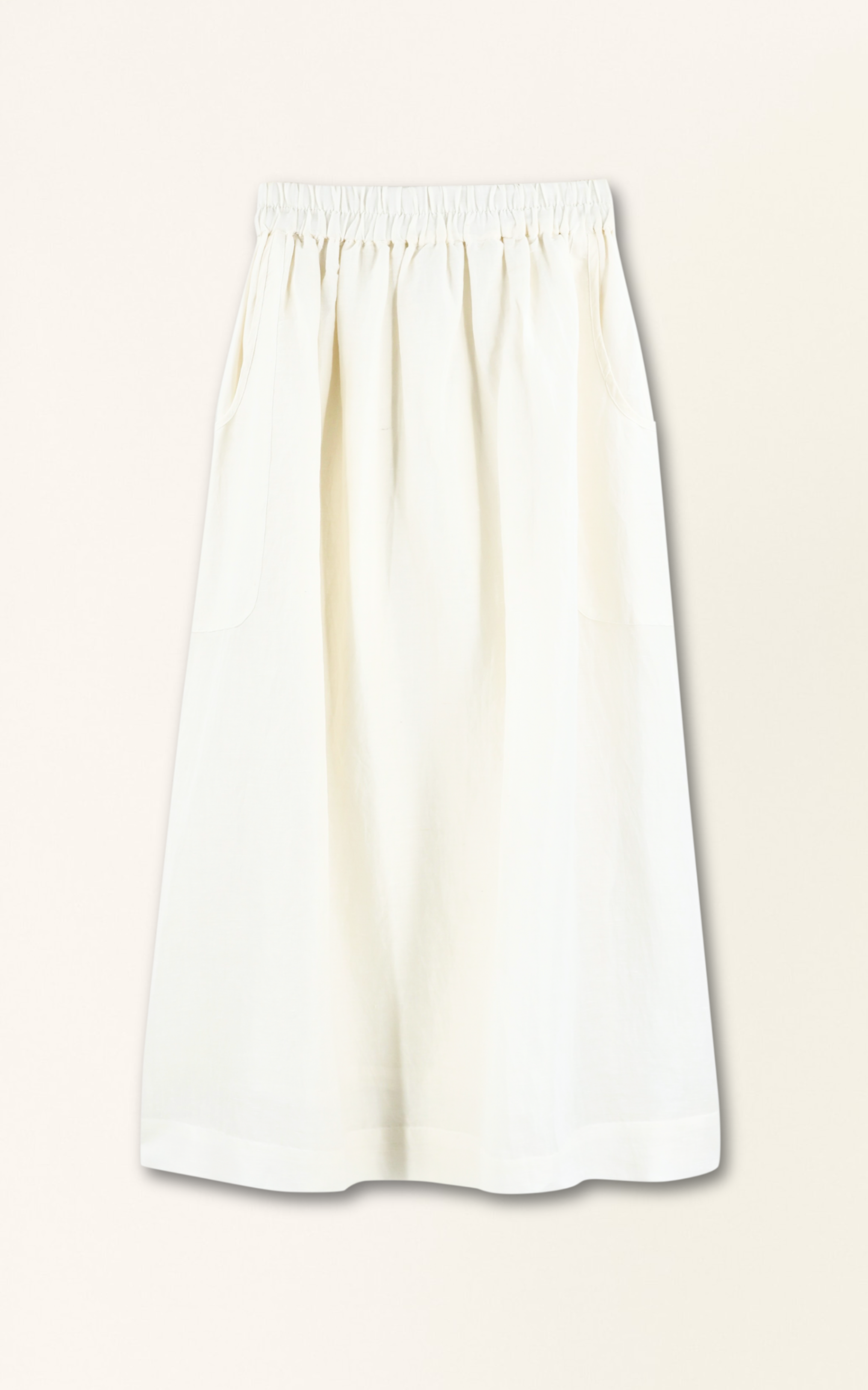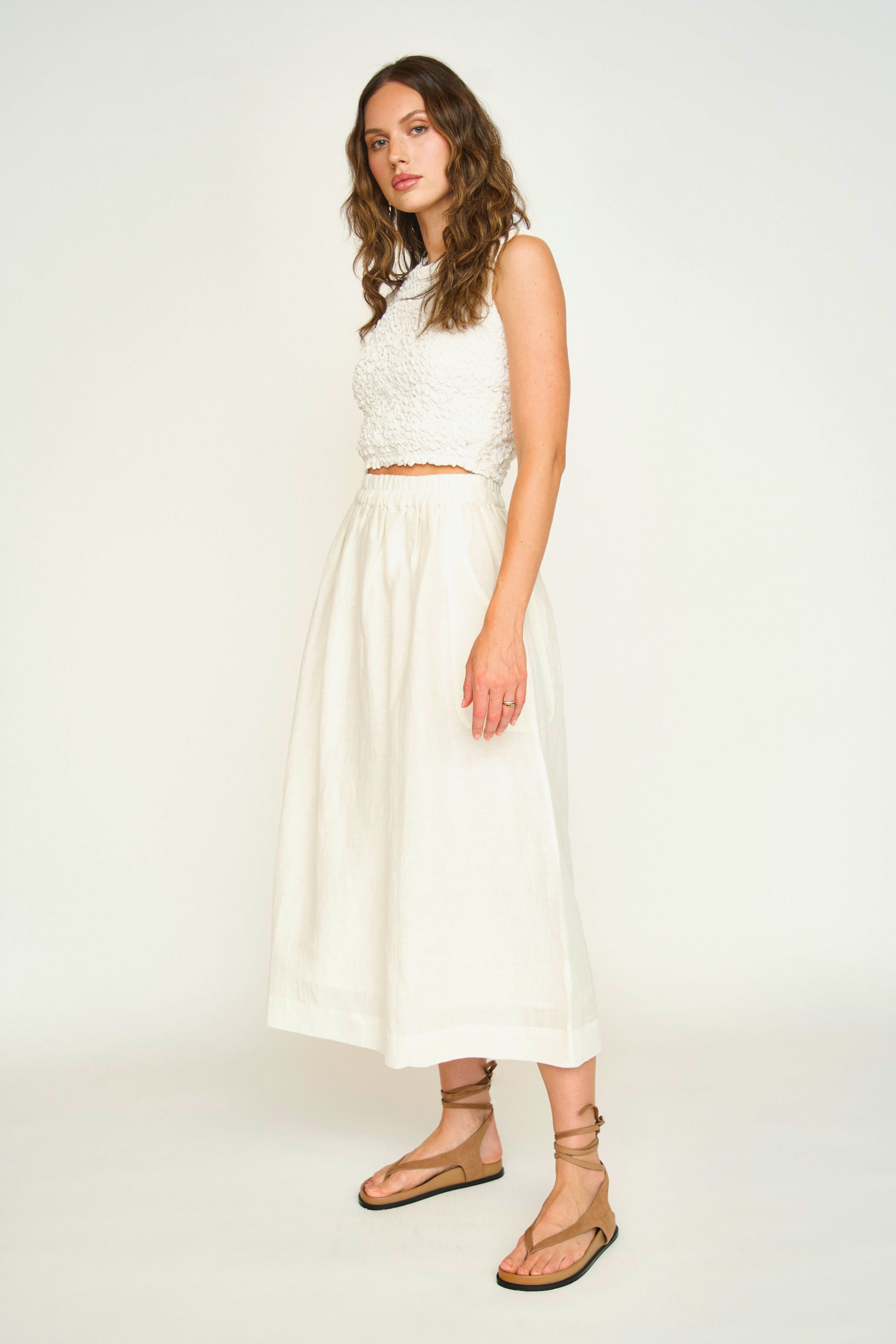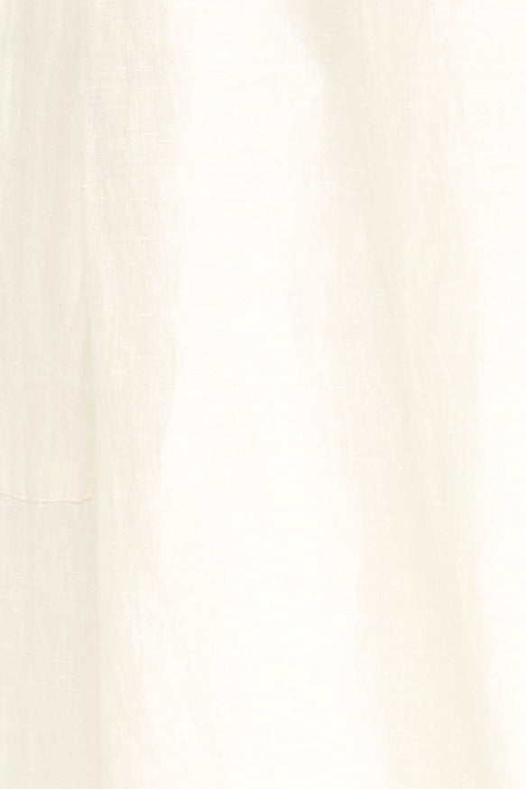 Fits true to size. This light linen fabric creates a bouncy look in the skirt.