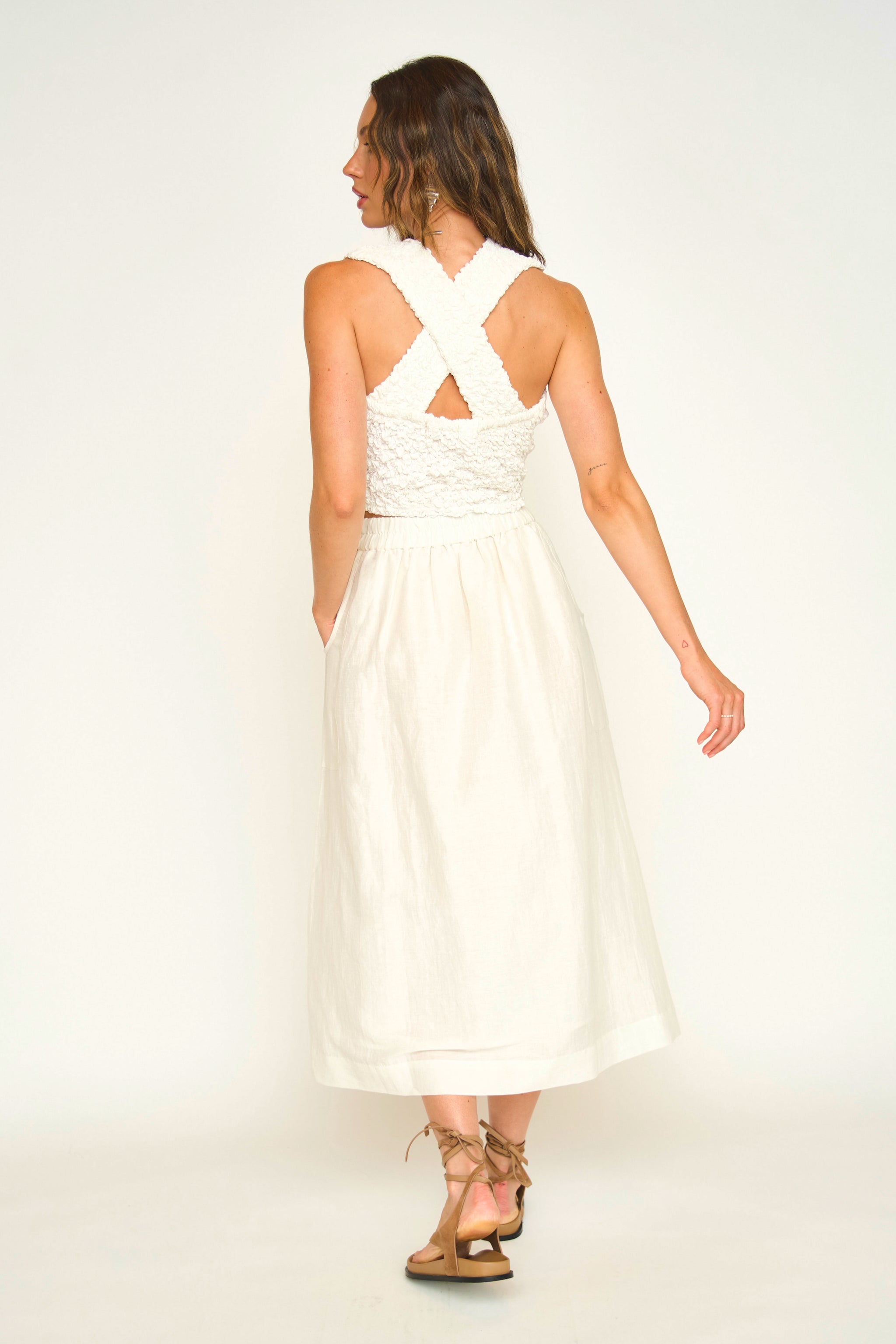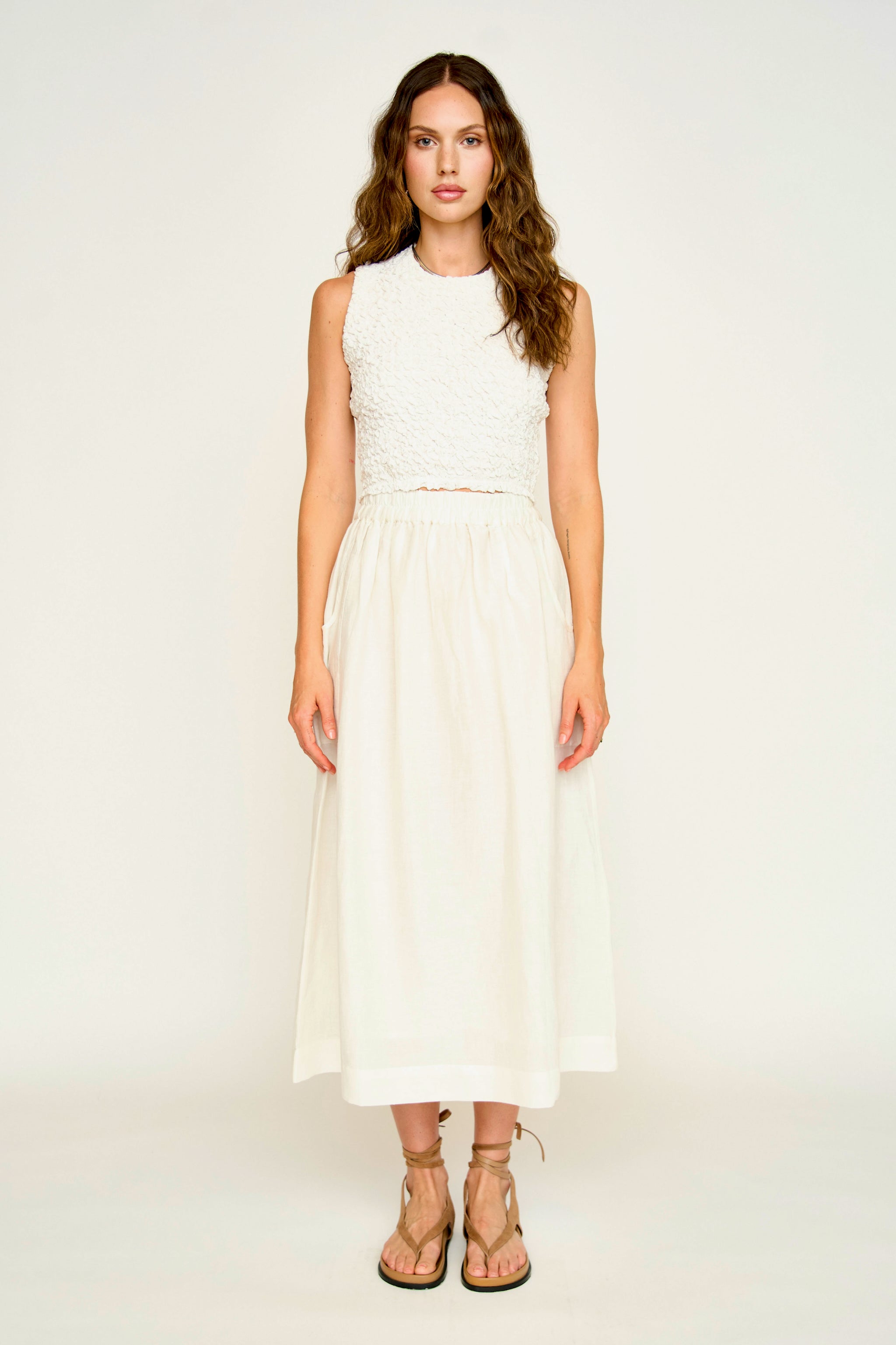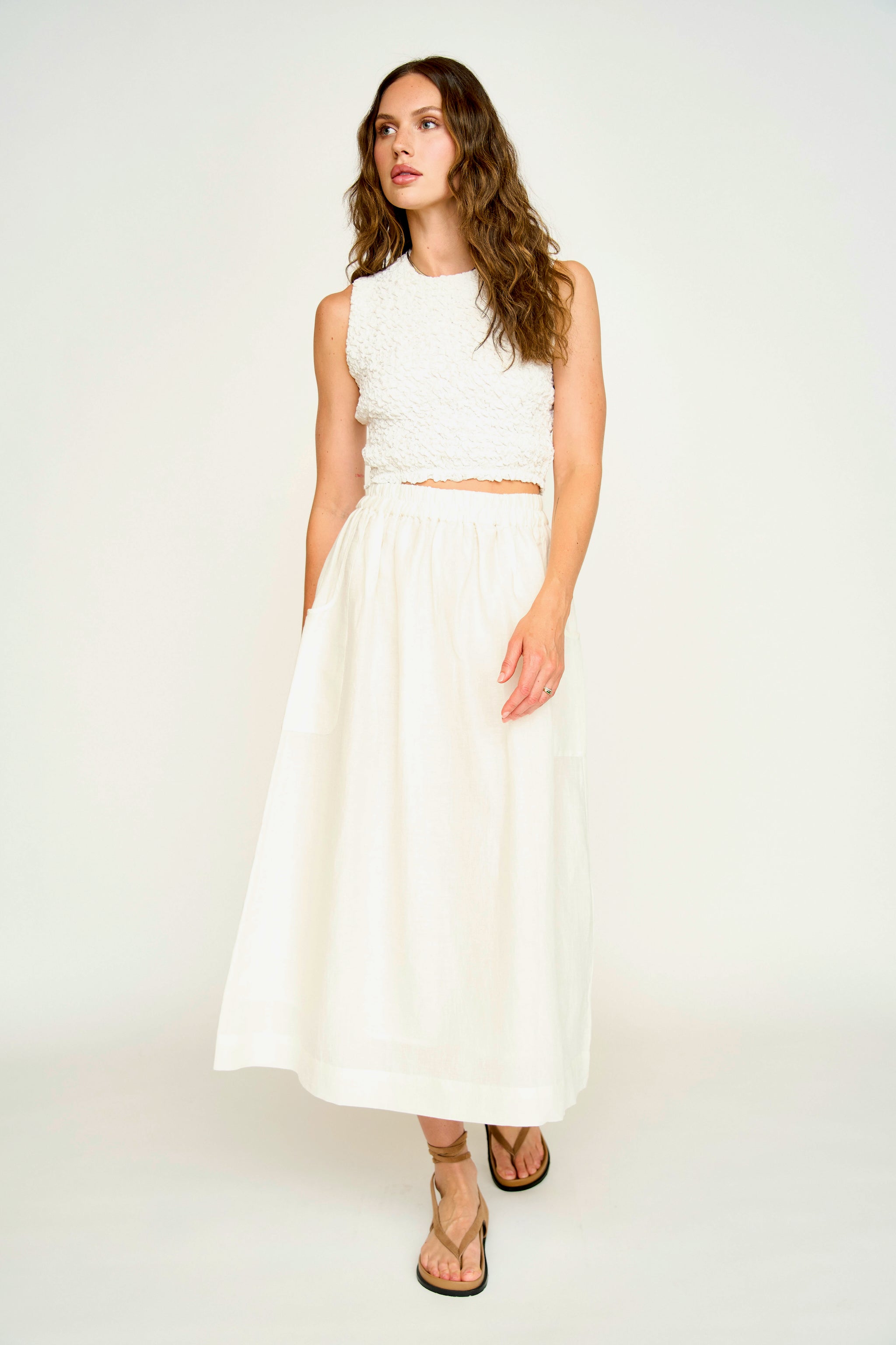 Fits true to size. This light linen fabric creates a bouncy look in the skirt.