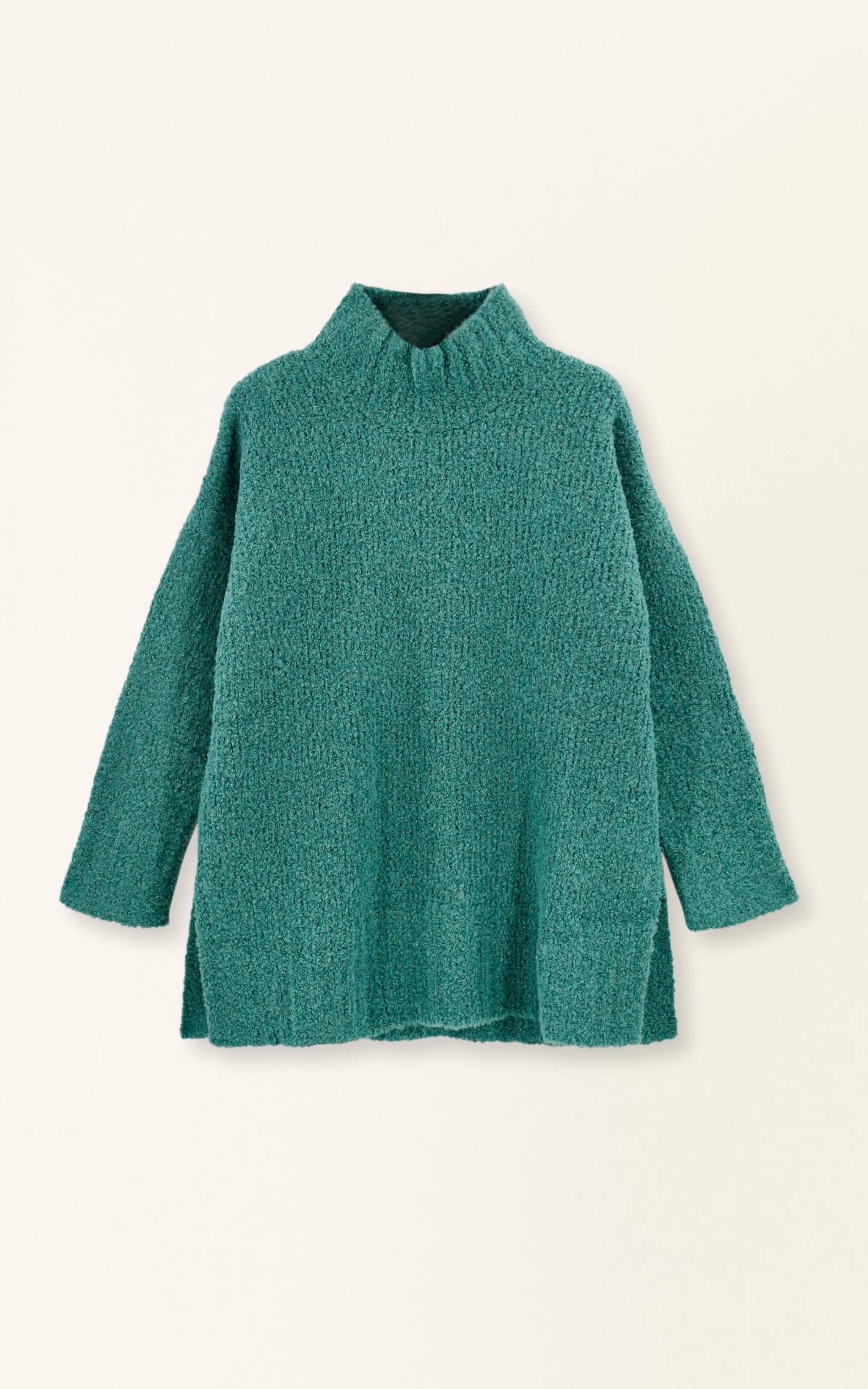 - Mid weight soft and fuzzy boucle turtleneck sweater