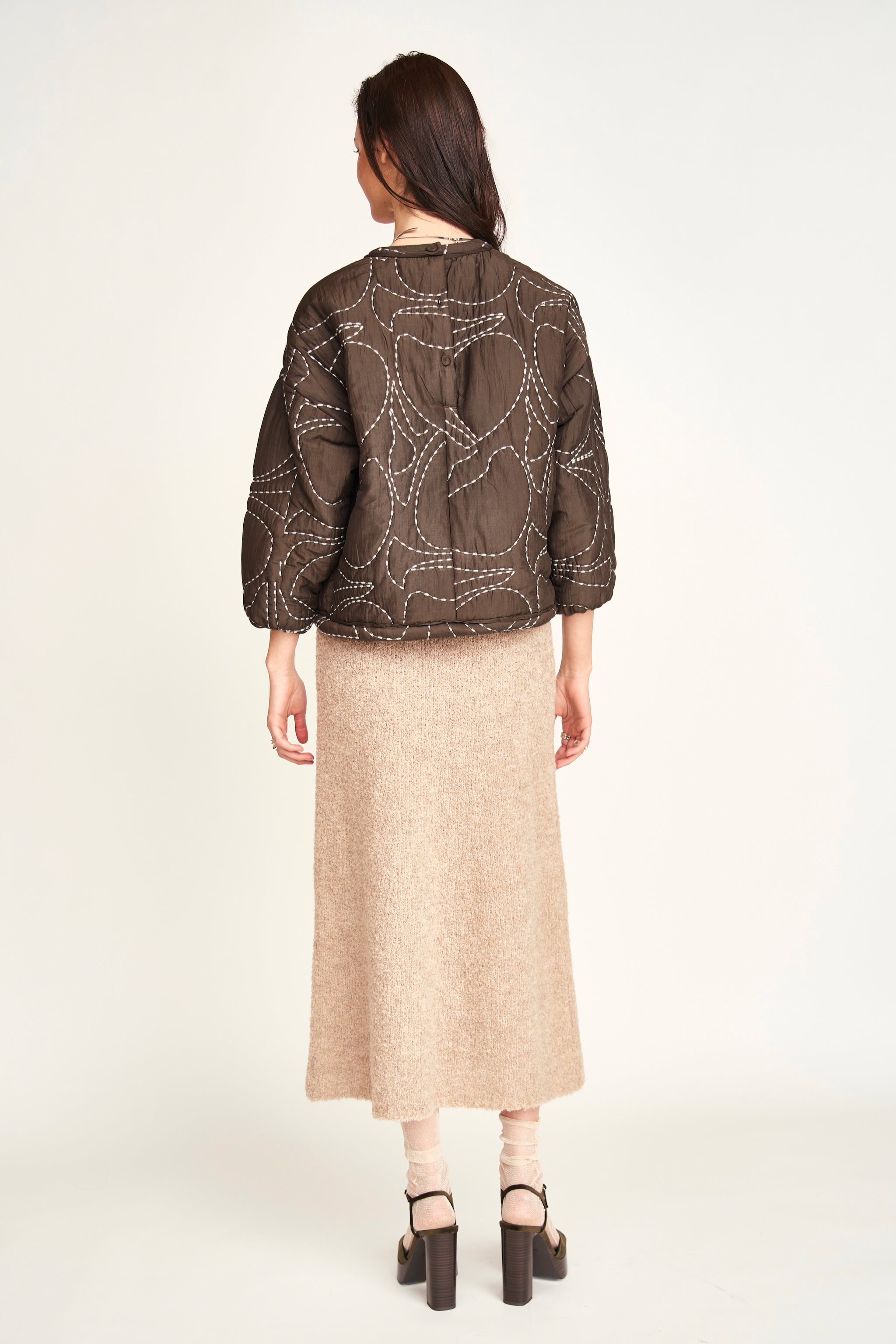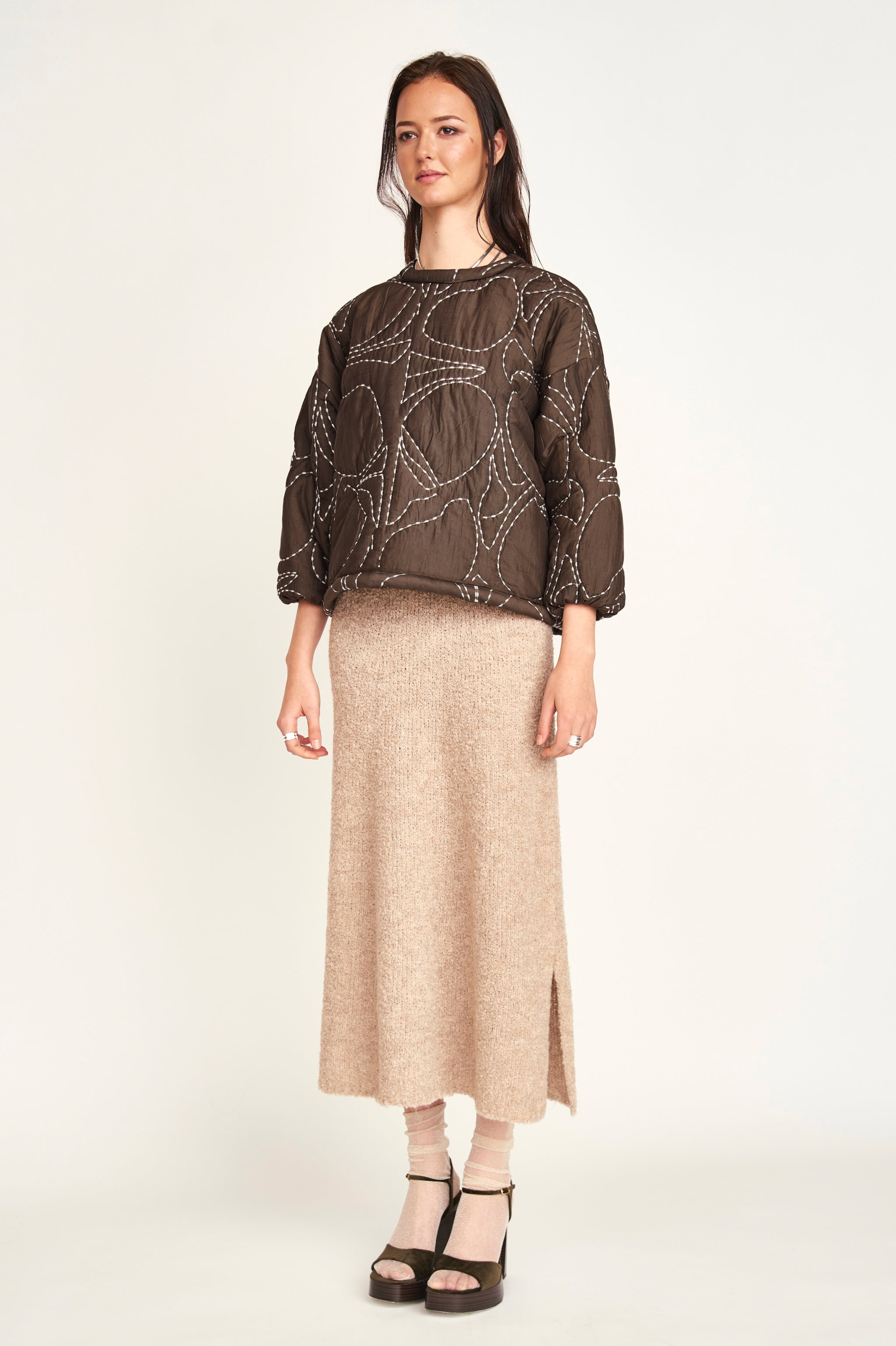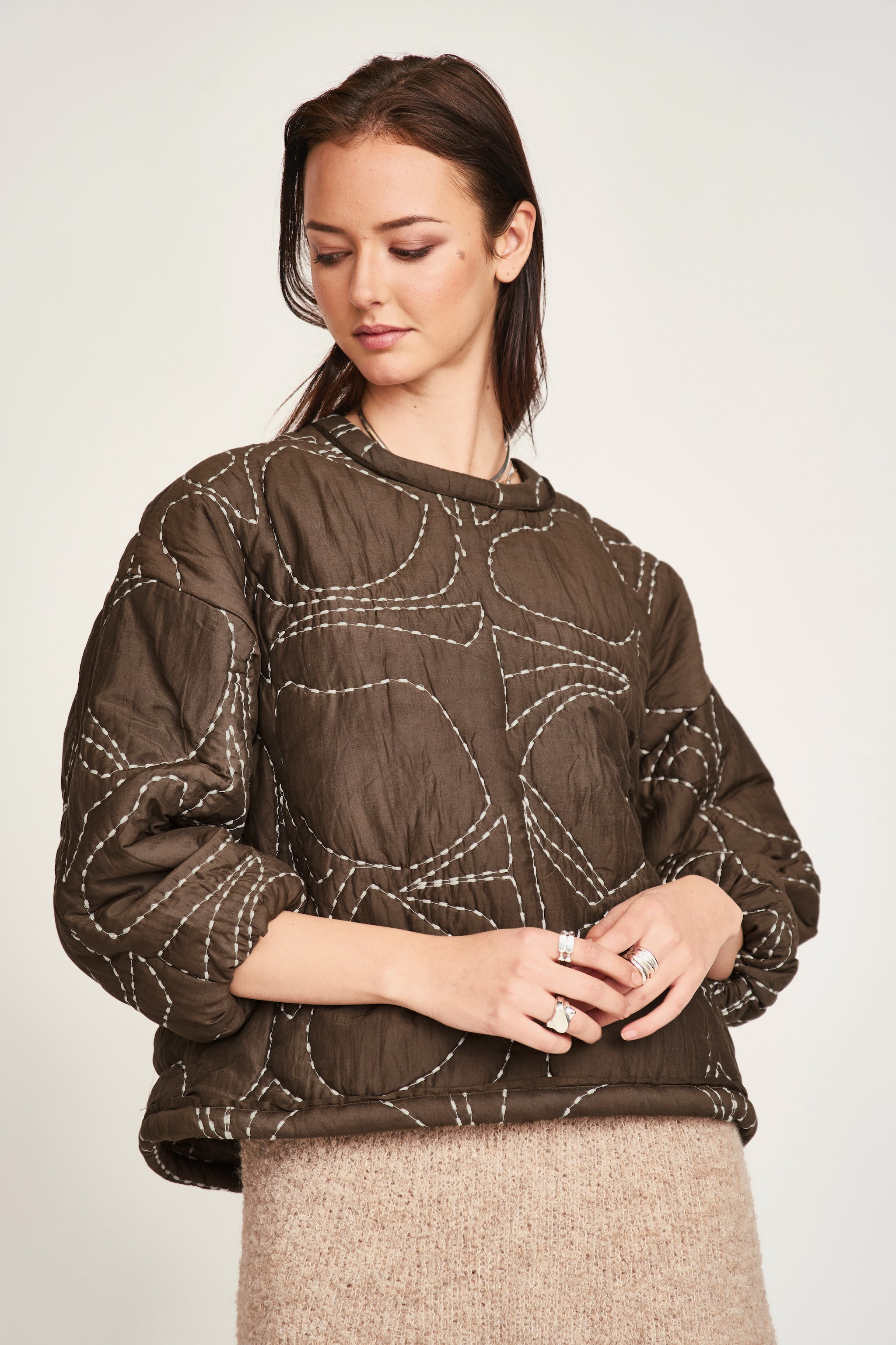 - An elevated quilted sweatshirt made of a cotton silk blend with abstract running stitch quilting