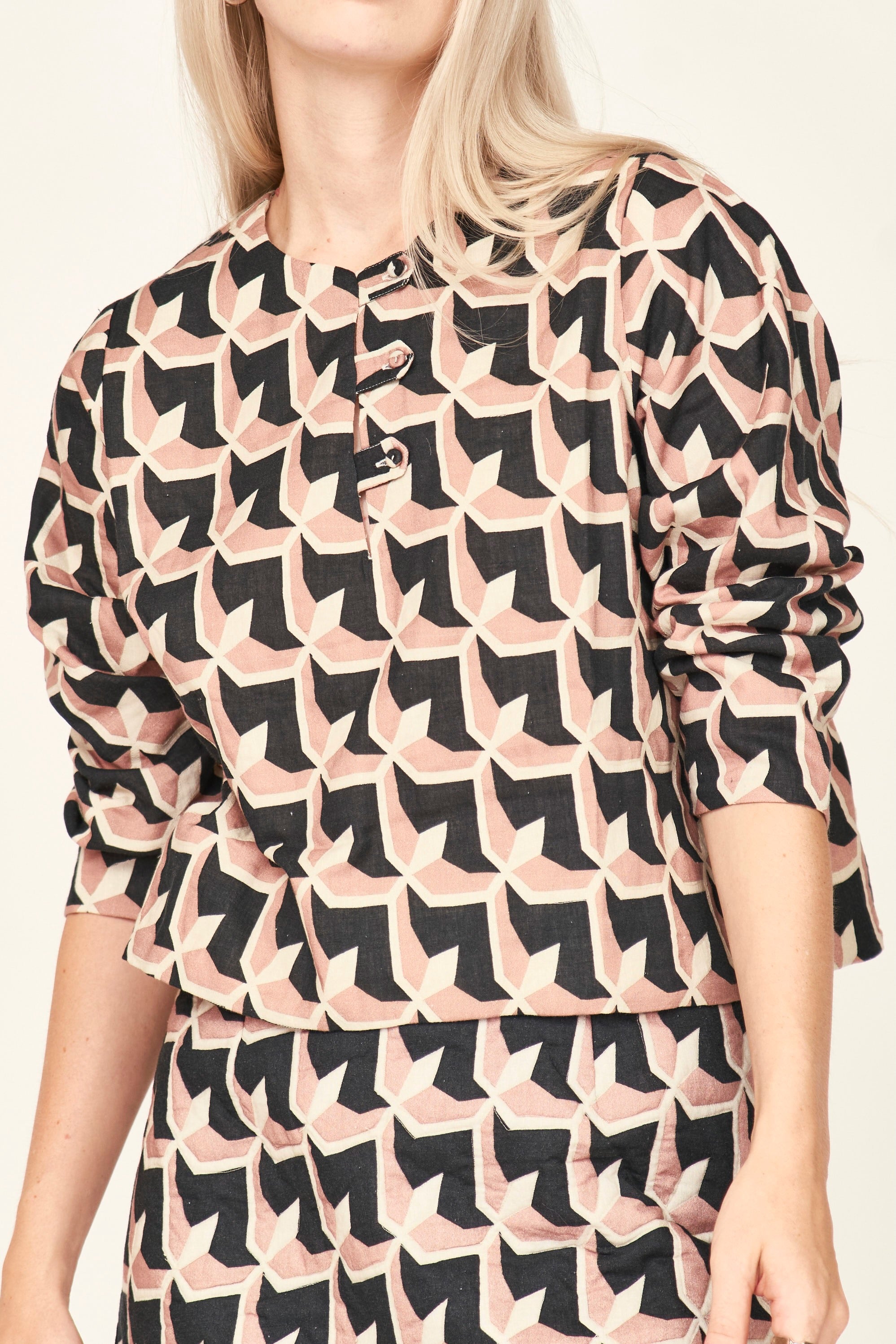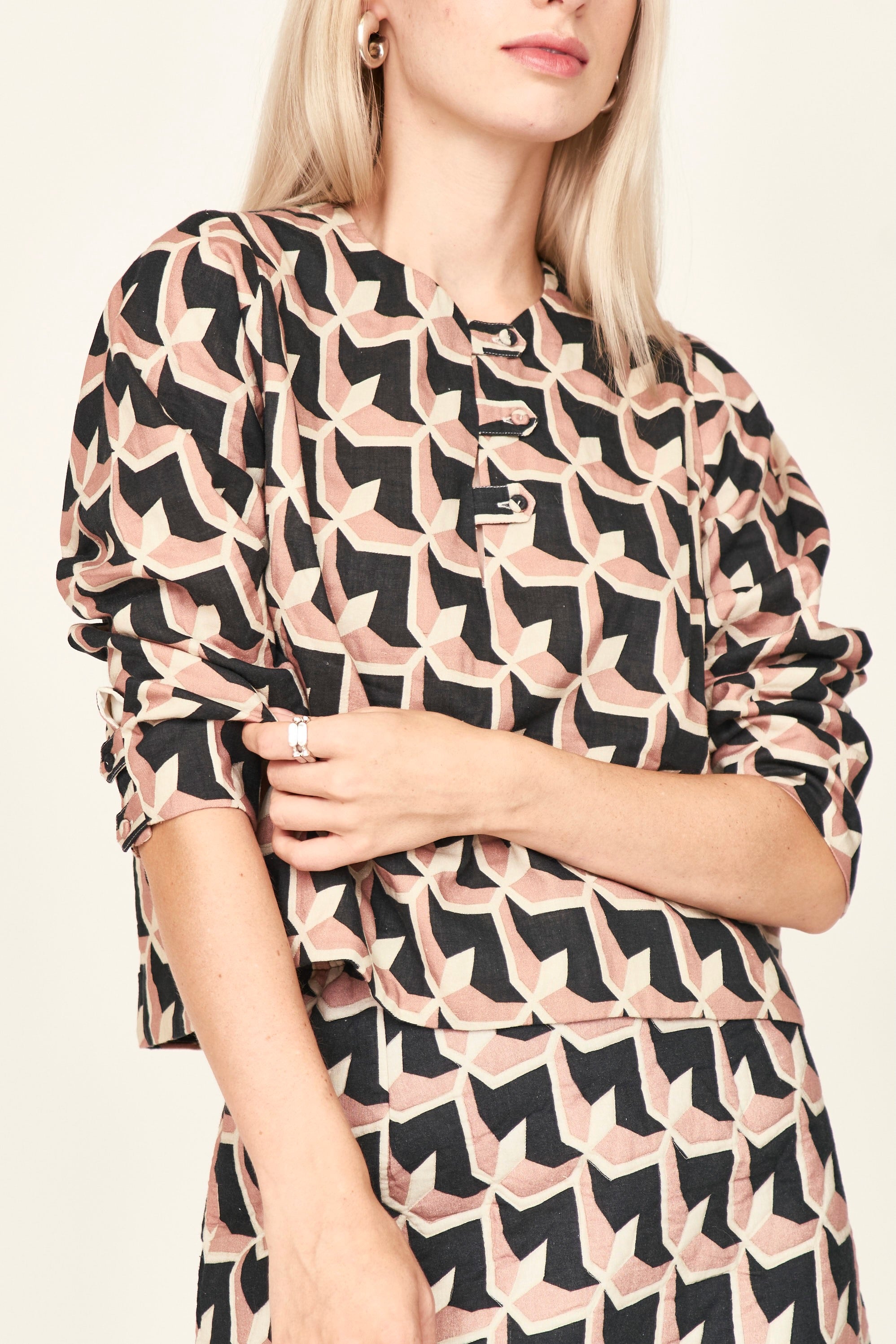 - Boxy fit blouse with front neck slit and tab button closure
