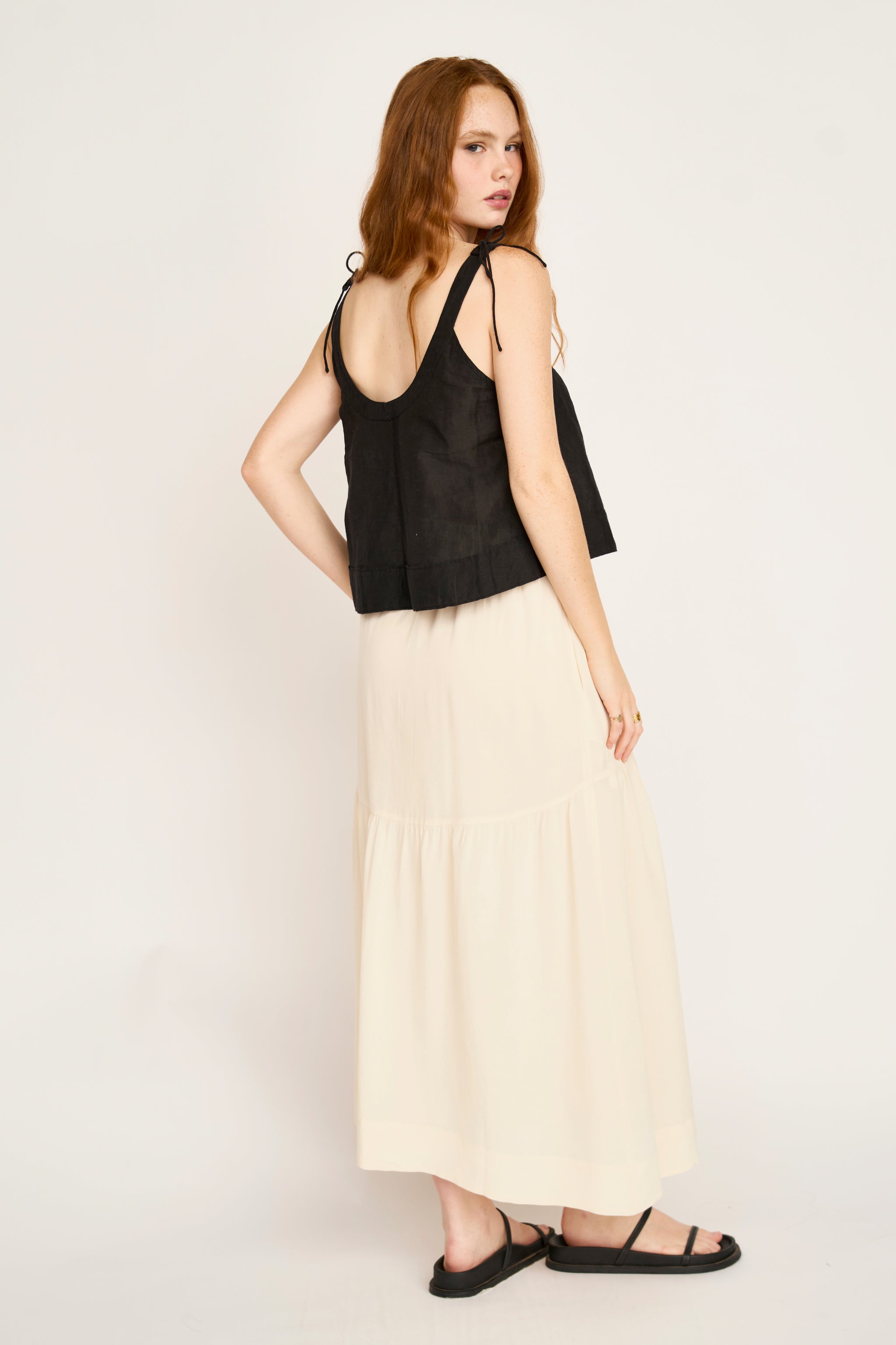 - Softly gathered, long tiered skirt